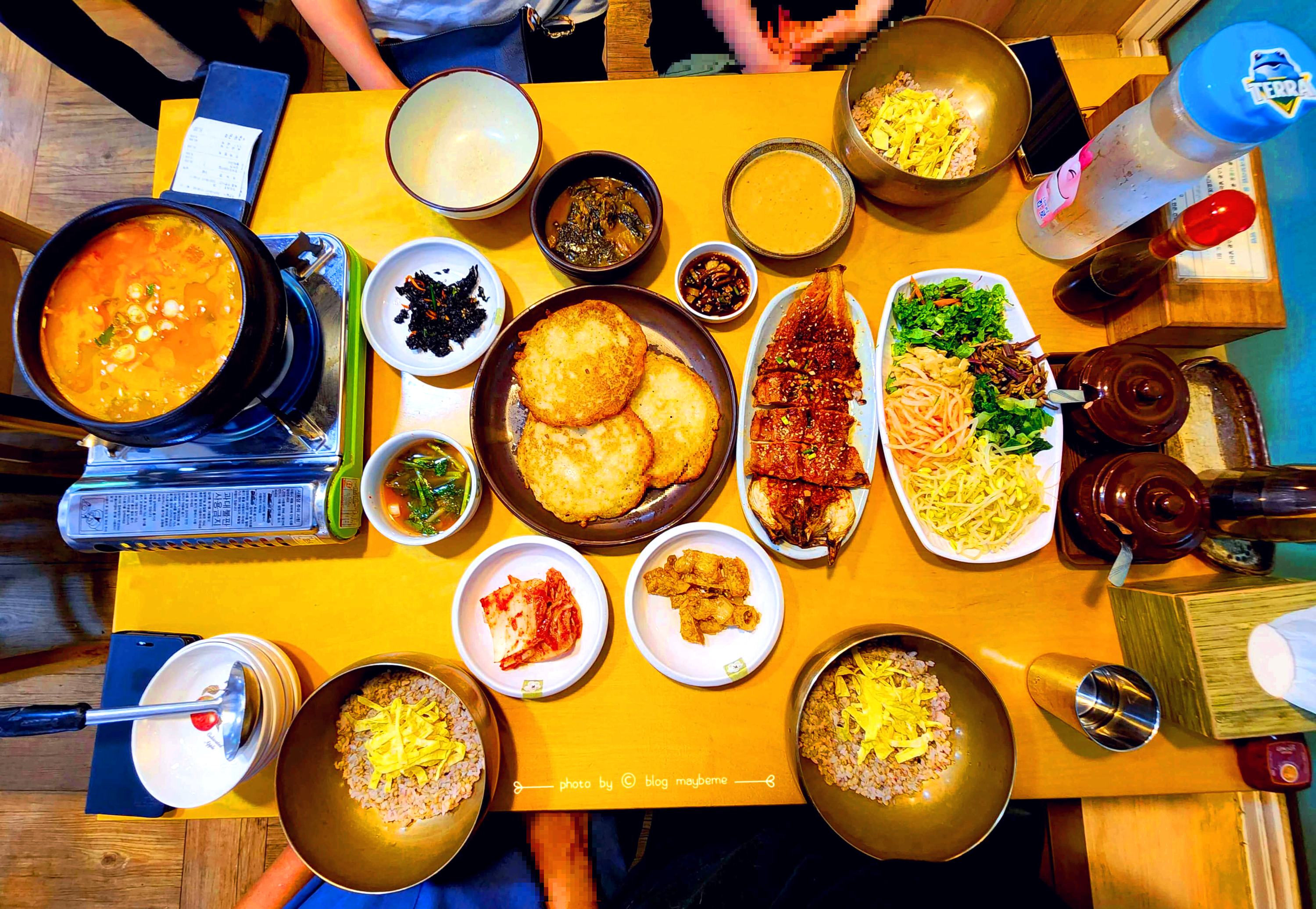 저희는 청국장과 보리밥 3인분 + 감자전 + 황태구이(단품) 이렇게 주문했어요. 청국장은 하나의 큰 뚝배기에 담겨 나왔어요. 보리밥 3인분 주문했는데 그릇을 하나 더 줘서 4인분처럼 먹었어요. 깨끗하게 잘 나오는 것 같아요. 반찬들도 맛있어서 잘 먹은 것 같아요. 비지로 만든 국도 나오는데 맛있어서 떠먹기도 했고 보리밥에도 넣어서 같이 먹었어요.