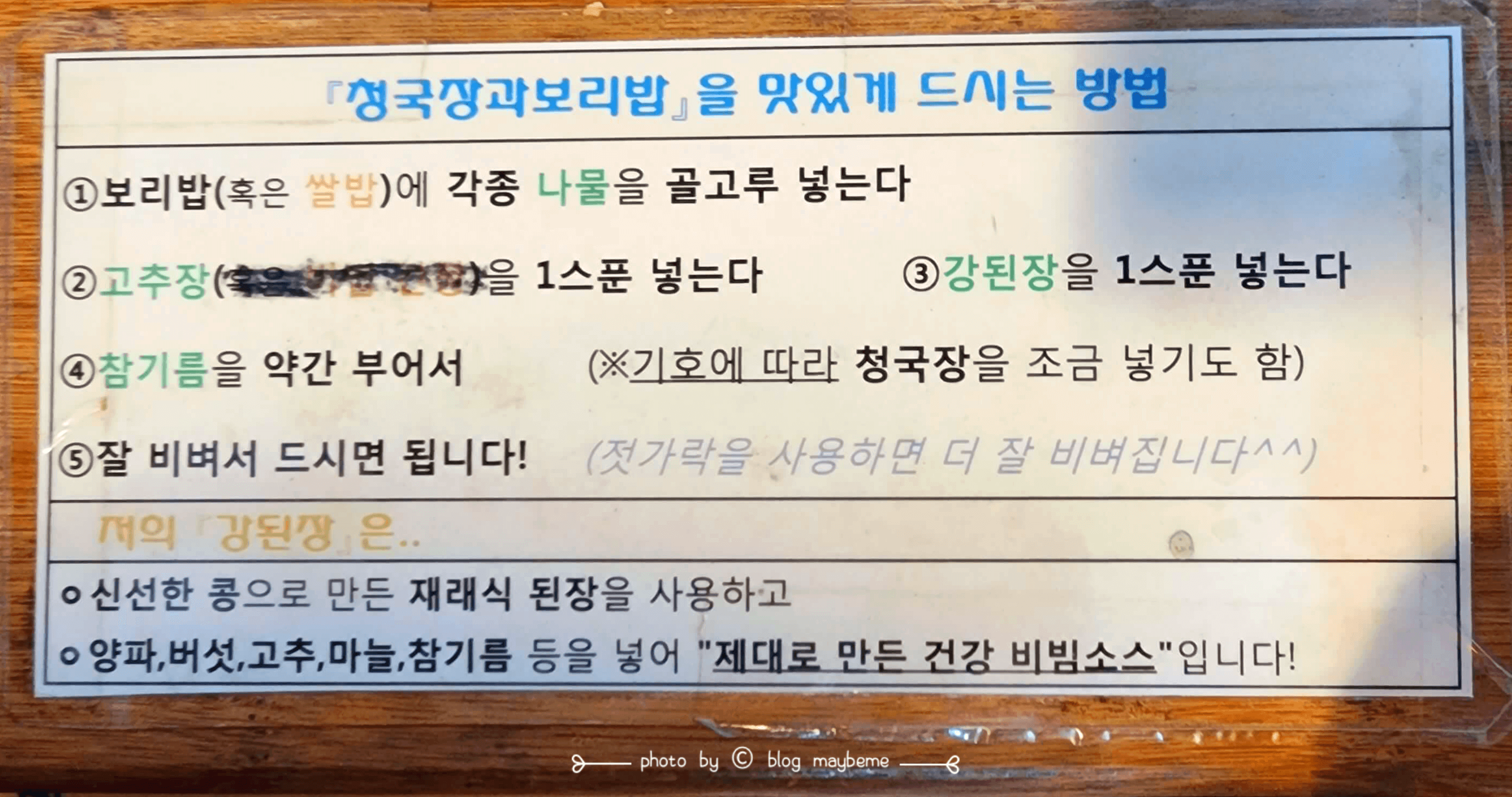 수저통 뚜껑 위에 '청국장과 보리밥'을 맛있게 먹는 방법이 적혀있더라고요. 적혀있는 방법대로 먹어도 맛이 있을 것 같네요. 근데 저는 고추장을 더 넣어서 이 방법대로 먹지는 않았어요. 강된장도 건강 비빔소스라고 하니 다음에 또 가게 되면 한번 넣어서 먹어봐야겠네요.