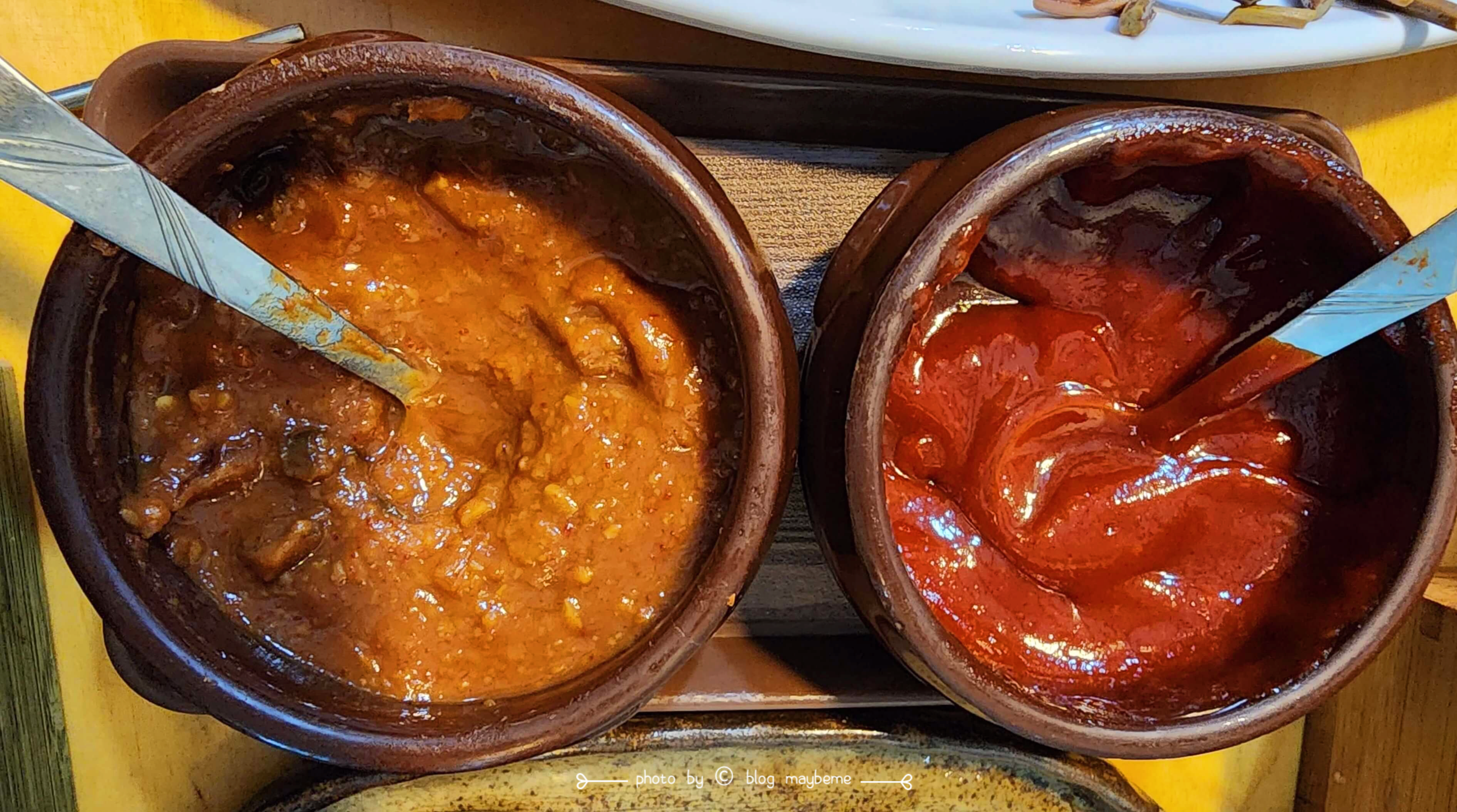 각 테이블에는 강된장과 고추장이 있어요. 필요한 만큼 덜어서 잘 맞게 넣을 수 있어서 좋은 것 같아요. 강된장은 신선한 콩으로 만든 재래식 된장을 사용하고 양파, 버섯, 고추, 마늘, 참기름 등 여러 재료를 넣어 제대로 만든 건강 비빔 소스라고 해요.