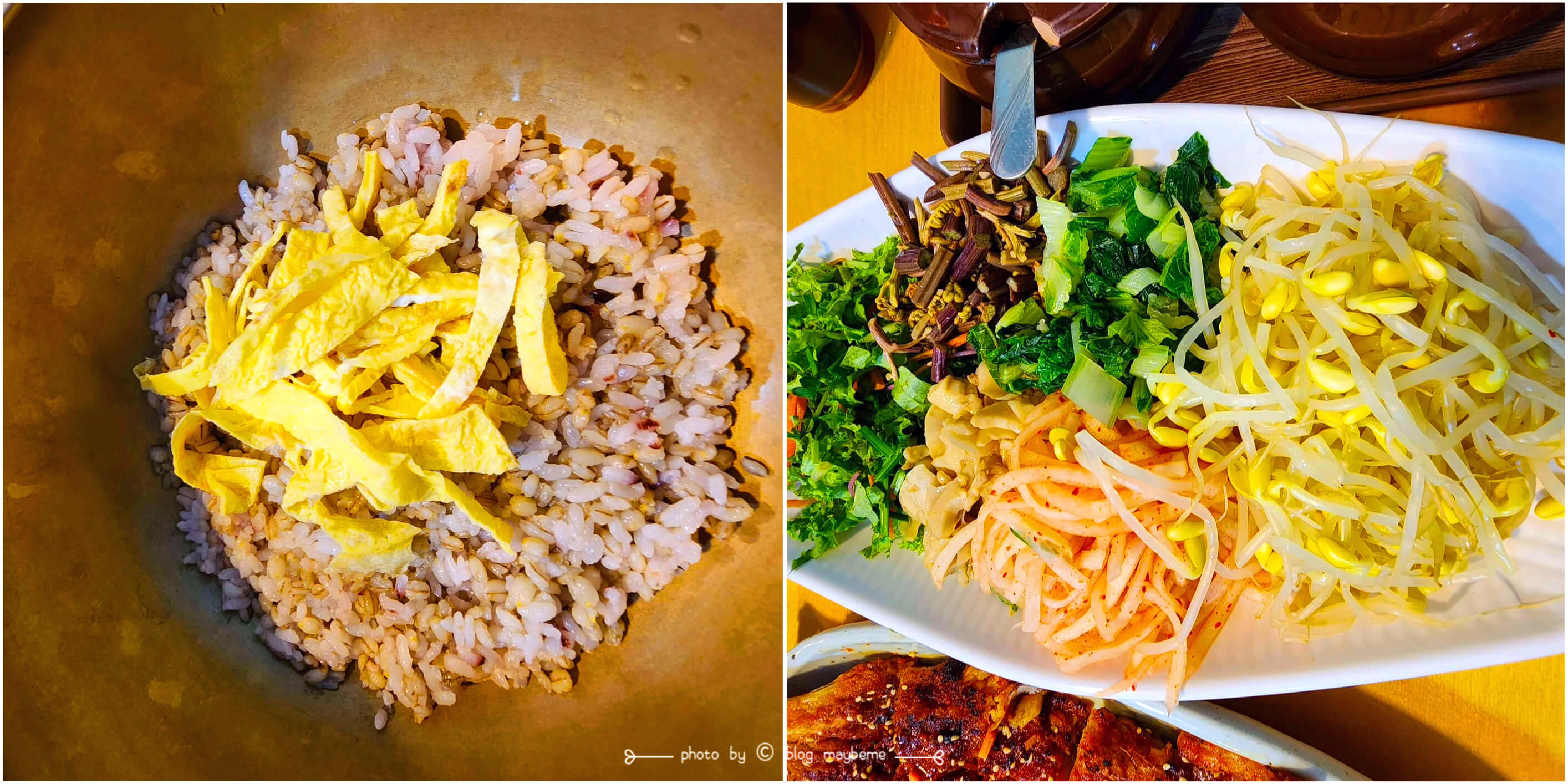 보리밥은 놋그릇 같은 곳에 나오는데 나물 잘 비빌 수 있게 넓고 큰 그릇에 나와서 편하게 비빌 수 있어요.