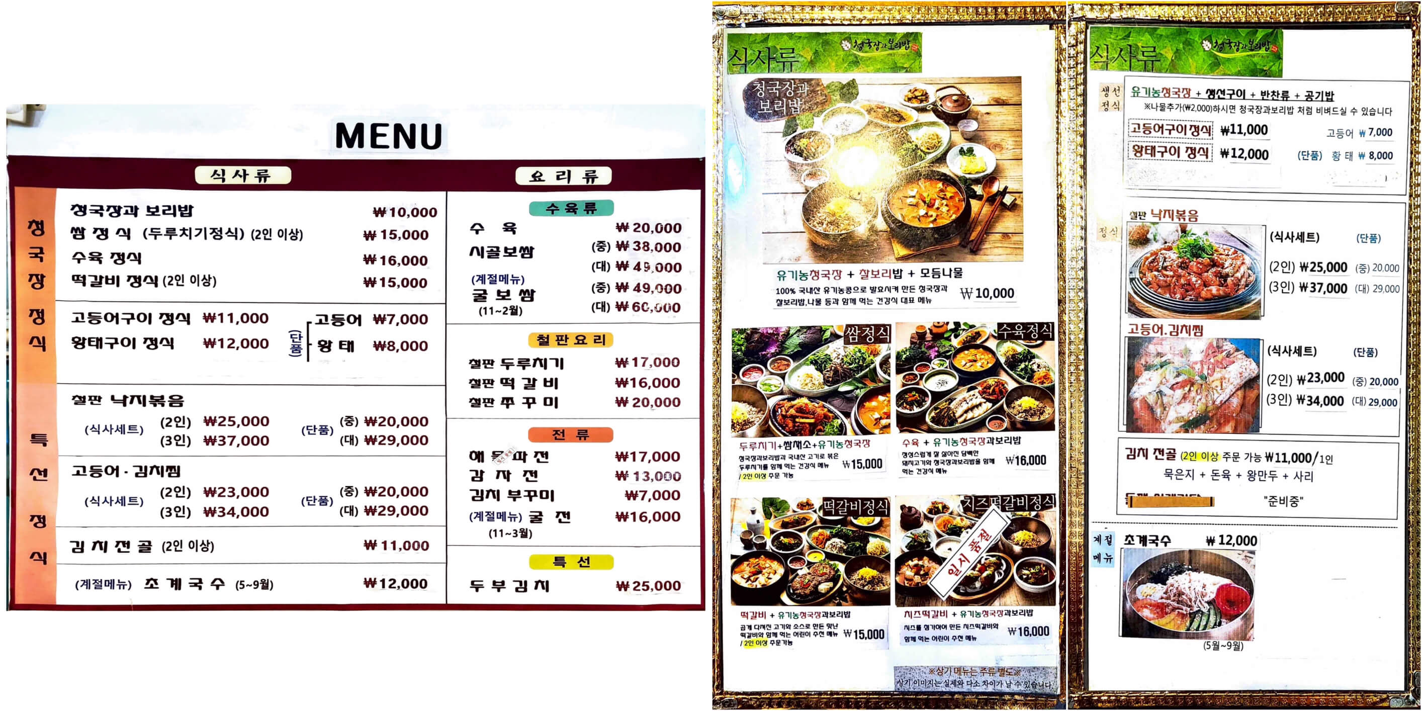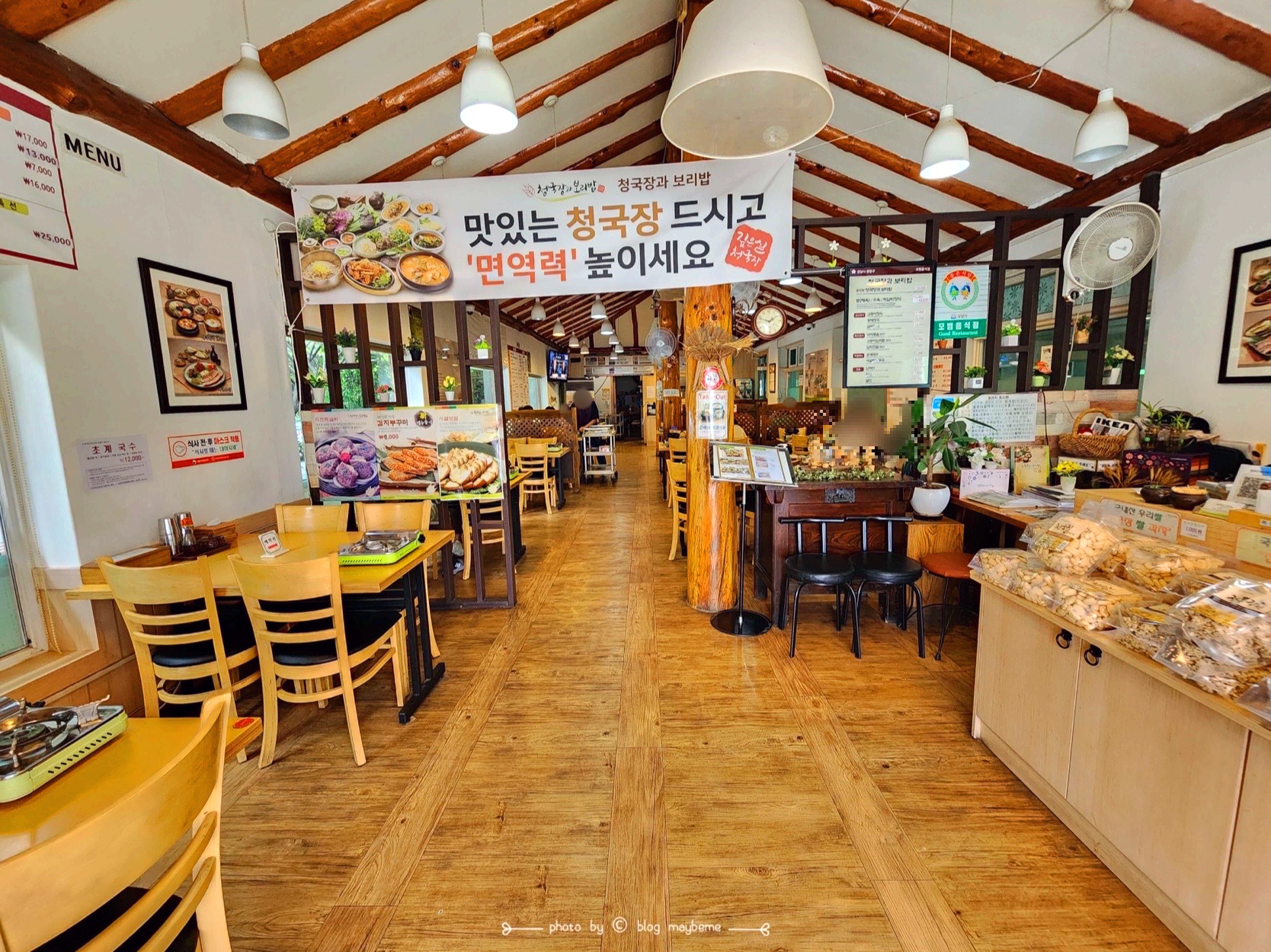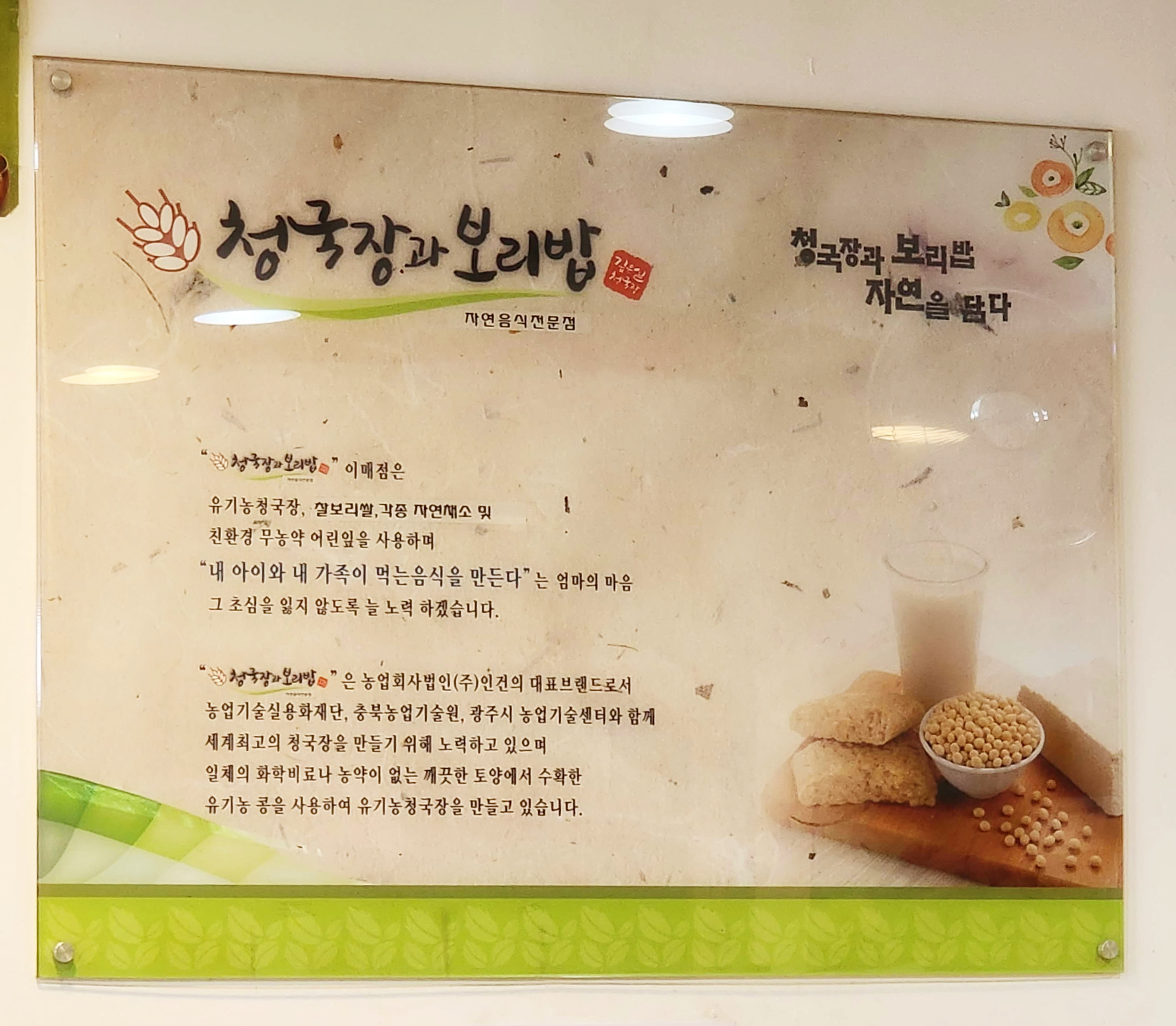 식당 내부 벽 쪽에 청국장과 보리밥 매장에 대한 설명이 있었어요. 청국장은 유기농으로 사용하고 각종 자연채소와 어린잎은 무농약으로 사용했다고 하네요. 화학비료나 농약 사용하지 않고 깨끗한 토양에서 수확한 유기농 콩을 사용해서 유기농 청국장을 만들었다고 하니 더 건강해지는 느낌이 들었어요.