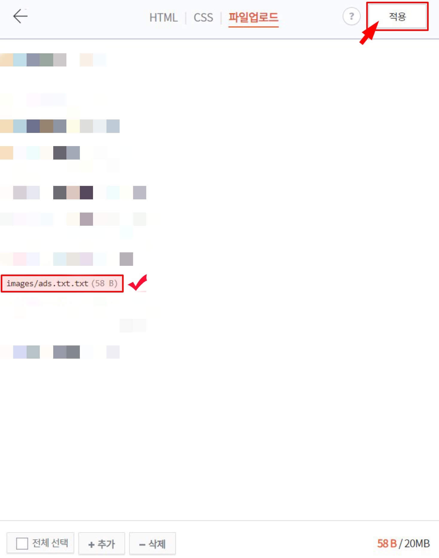 - 밑에 '+추가'를 클릭하여 저장한 ads.txt 파일을 업로드해 주세요.