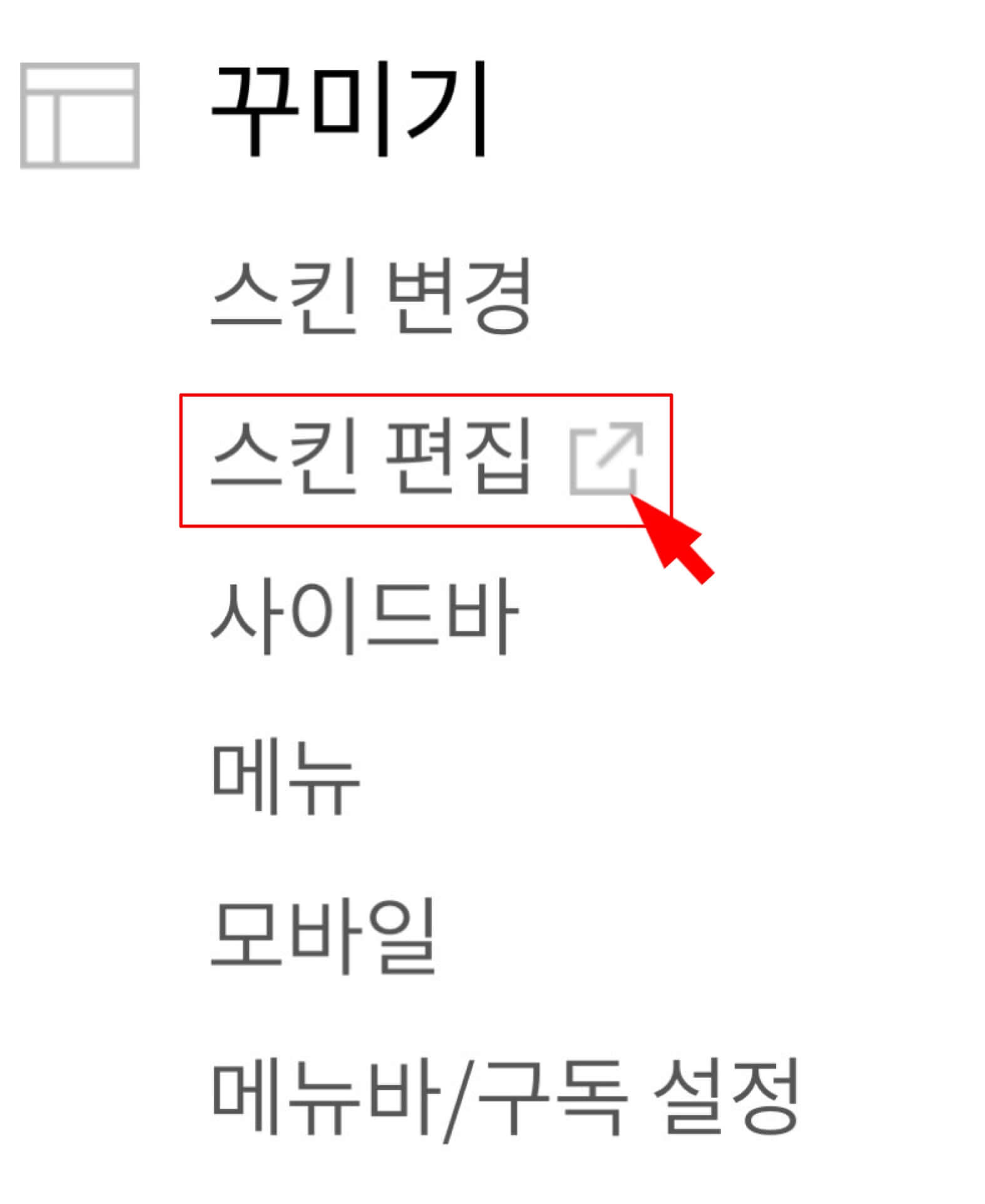 - '블로그 관리'에가서 왼쪽의 사이드 바에 있는 꾸미기 → 스킨편집으로 들어갑니다.