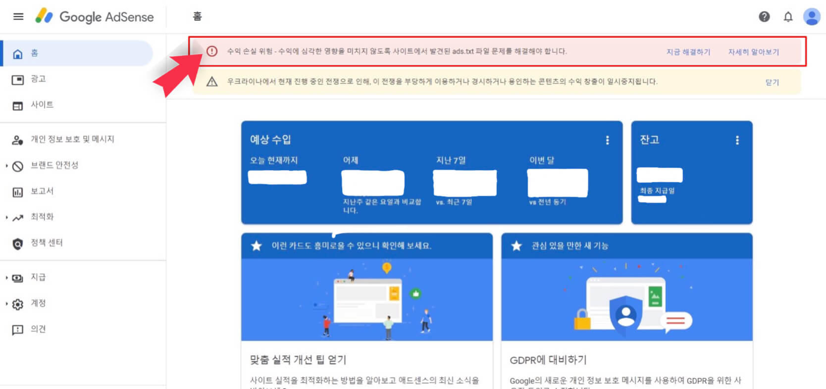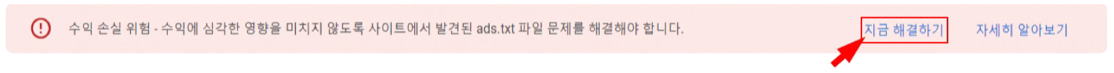 구글 에드센스 승인 이메일을 받고 나서 에드센스 홈페이지에 들어가게 되면 '수익 손실 위험 - 수익에 심각한 영향을 미치지 않도록 사이트에서 발견된 ads.txt 파일 문제를 해결해야 합니다'라고 적혀있는 빨간색 창이 뜨게 됩니다. 수익에 손실이 있다고 하니 무섭기도 하고 두려운 마음이 들게 하는 것 같아요.