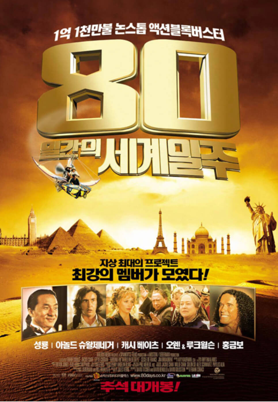 내가 가족과 함께 영화관에서 처음으로 본 이 영화는 2004년도에 개봉하였다. 장르는 코미디, 가족, 로맨스, 멜로, 액션, 어드벤처이다. 출연하는 배우들이 세계적으로 많이 알려진 배우들이다. 그래서 각 배우들의 특성에 맞게 장르가 다양한 것 같다. 가족과 함께 볼 수 있고 코미디 장면이 많이 나와서 웃으면서 볼 수 있었다. 또 로맨스와 멜로 그리고 액션도 골고루 잘 섞여서 표현되고 있고 세계일주 자체가 모험이니 어드벤처로 잘 보여주는 영화인 것 같다. ‘성룡’이 나오기 때문에 중국 배경도 나오고 코미디 적인 액션, 쿵후와 같은 장면들도 나온다. 책으로도 읽었지만 책과는 내용이 다른 점이 많았다. 예를 들어 터키 왕자의 ’ 생각하는 로뎅‘이라는 동상이 나온다던가 라우싱의 고향에서 신성하게 여기는 옥 부처를 되찾기 위해 은행을 터는 장면들은 책에서는 나오지 않는다. 하지만 웃음 포인트를 주고 더 재미있게 만들려는 의도인 것 같다. 다시 봐도 재미있는 영화로 추천해주고 싶다.