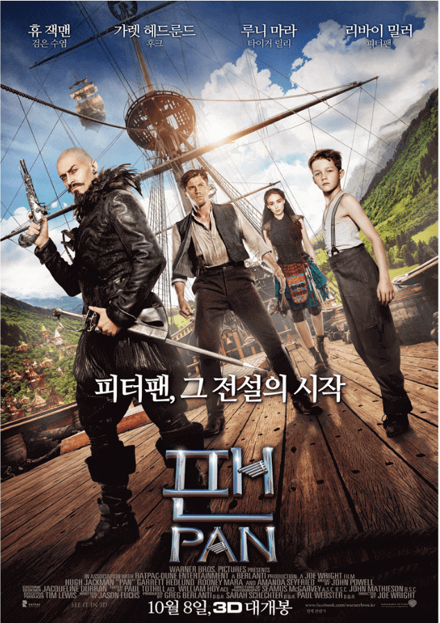 2015년 10월 8일에 개봉한 영화 <팬> 은 피터팬이 태어나서 어떻게 네버랜드로 가게 되었는지 또 막 도착했을 때 그 시작을 보여주는 내용입니다. 장르는 모험, 가족, 판타지이고 제임스 매슈 배리 ‘ 피터 팬 ’을 원작을 두고 있습니다. 감독은 ‘조 라이트’이고 ‘제이슨 푸치스’가 각본을 하였습니다. 리바이 밀러(피터 팬 역), 휴 잭맨(검은 수염 역), 가렛 헤드룬드(제임스 후크 역), 루니 마라(타이거 릴리 역), 아만다 사이프리드(메리 역)등 이 출연하였습니다. 주인공 역인 리바이 밀러는 이 영화가 데뷔작이라고 합니다. 아만다 사이프리드는 피터팬의 어머니로 나오는데 역할이 잘 맞게 나왔다고 하는 평가도 있습니다. 상영 시간은 111분이고 상영 등급은 전체 관람가로 모든 연령이 감상을 할 수 있습니다.
