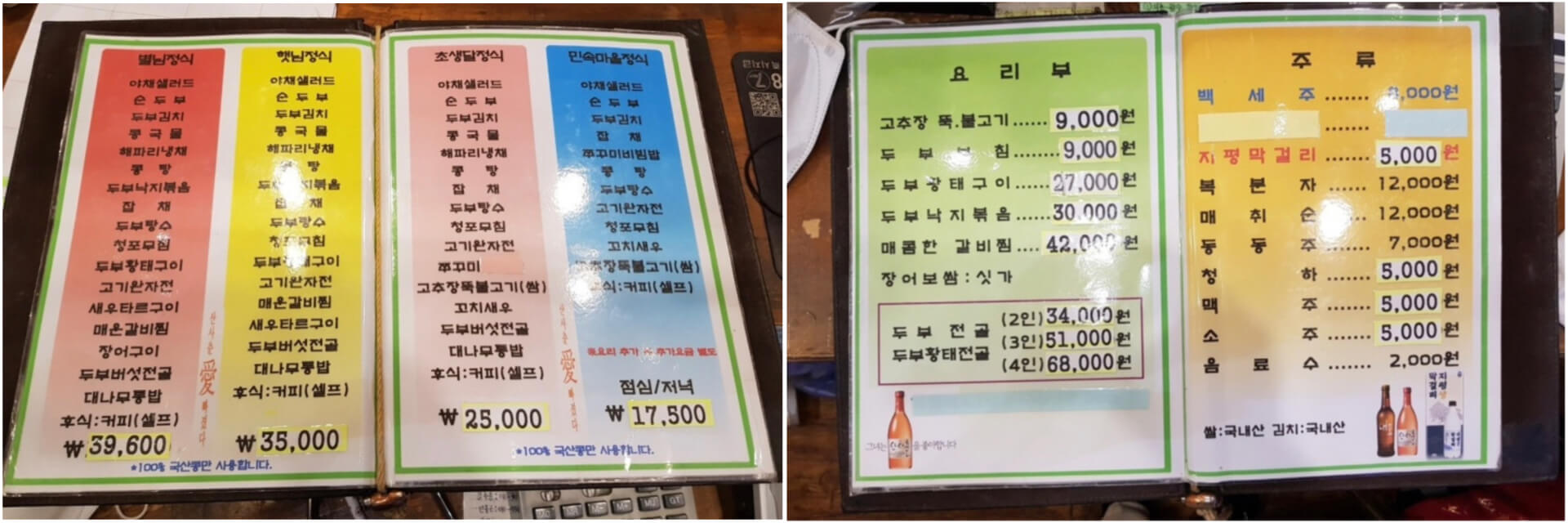 출처 : 민속마을 콩두부 페이지 (메뉴판)