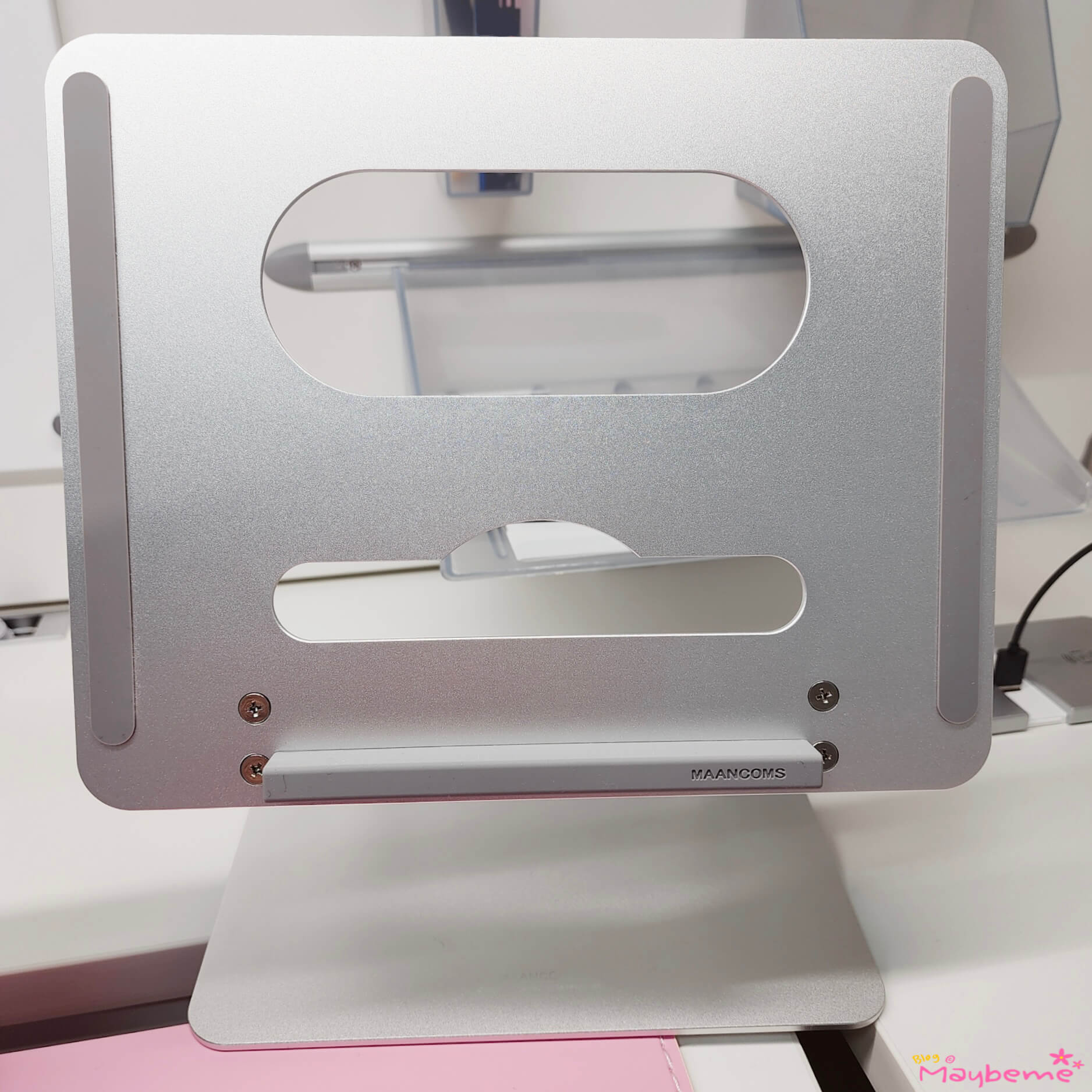 주로 아이패드를 올려놓고 사용하는데 크기가 잘 맞았어요. 노트북이나 아이패드 같은 전자기기는 사용하다 보면 열이 발생하는데 거치대 상판이 뚫려 있어서 열 방출도 잘 돼서 뜨겁지 않게 사용이 가능해요. 그리고 안정감이 있어서 넘어질 걱정이 없어요. 거치대 상판에 있는 받침대가 실리콘으로 되어 있어서 흠집 걱정이 없고 양쪽에도 미끄럼 방지 실리콘이 붙어 있어 밀리지 않아요.