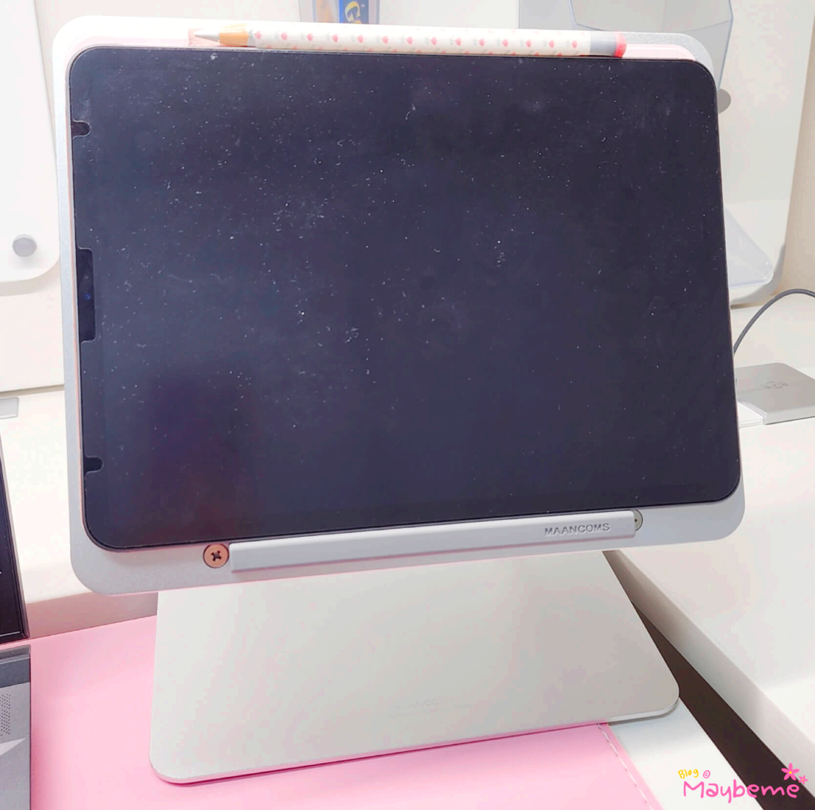 아쉬운 점은 아이패드를 세로로 쓸 때가 있는데 충전하면서 쓰기에는 살짝 불편해서 상판에 있는 받침대에 충전기 연결할만한 구멍이 있었으면 더 좋았겠다는 생각이 들었어요. 하지만 가로로 사용할 때가 더 많기 때문에 감수할 수 있는 부분이었어요. 제일 좋은 부분은 높낮이와 각도 조절을 내 눈높이에 맞출 수 있다는 점에서 정말 만족하는 제품이에요.