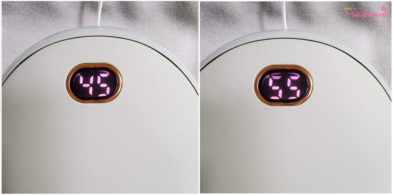 on/off 버튼 도 잘 작동이 되고 버튼에 색깔 표시되는 등도 있는데 2단 온도조절이 되는 기능이기도 합니다. 버튼을 1번 누르면 1단으로 백색등이 뜨고 온도는 45도까지 올라가고 한번 더 누르면 2단 홍색등으로 55도까지 올라가요. 2단에서 한 번 더 누르면 전원 off입니다.