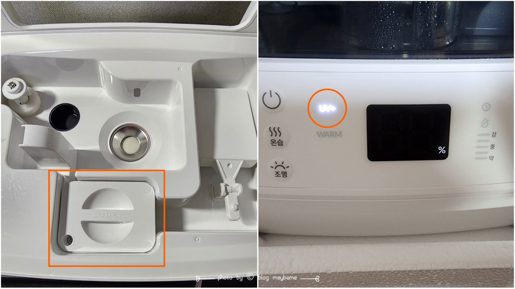 물이 없으면 물 없음 표시가 빨간불로 깜빡거려서 물 보충 해야 할 때도 알려주는 것 같아요. 사실 물통이 투명해서 볼 수 있기는 한 것 같아요. 물이 없이는 전원도 자동으로 꺼지고 물을 보충하면 자동으로 다시 작동됩니다.