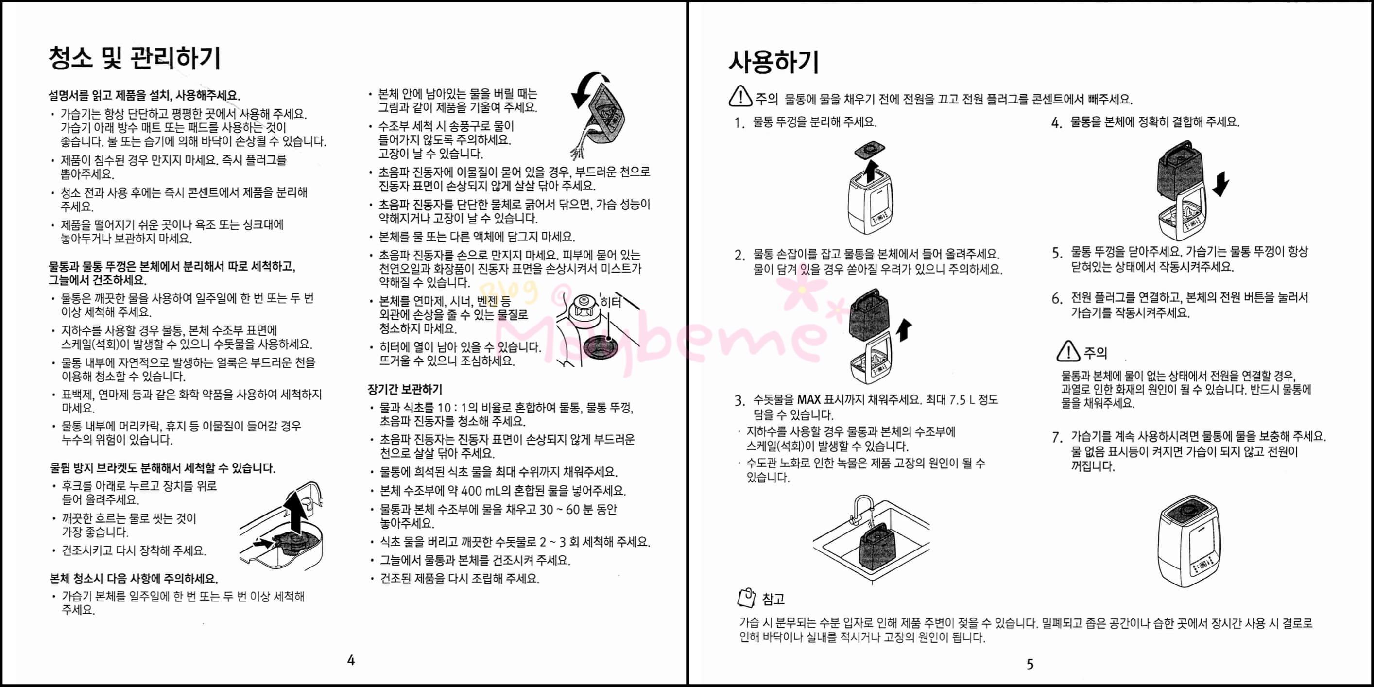제품 구성으로는 가습기 본체 + 물통 + 물통 뚜껑 + 사용 설명서 이렇게 되어 있습니다. 사용설명서에는 제품보증서가 있어서 수리를 요할 때 꼭 제시하라고 되어있어서 버리면 안 될 것 같아요. 설명서도 올려봅니다.