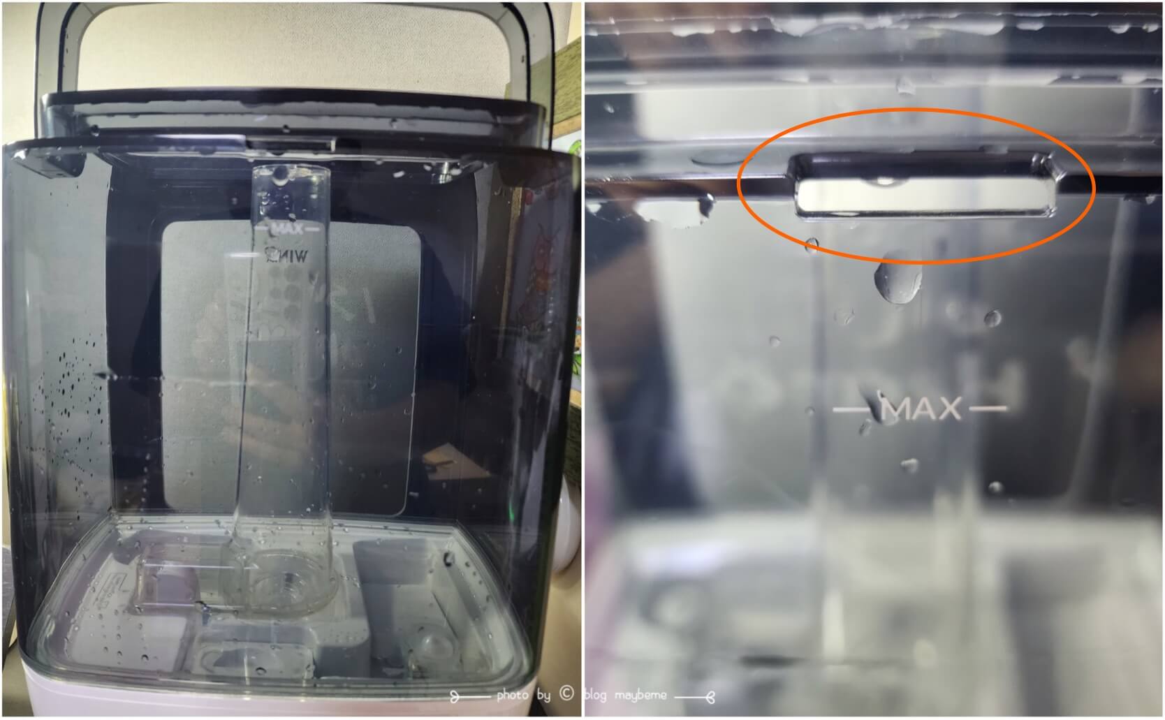 물통 위쪽에 길쭉한 구멍이 있는데 물통을 세척하고 물을 뺄 때 남아있는 물이 다 빠져나갈 수 있게 되어있는 것 같았어요. 물을 깔끔하게 뺄 수 있었어요.