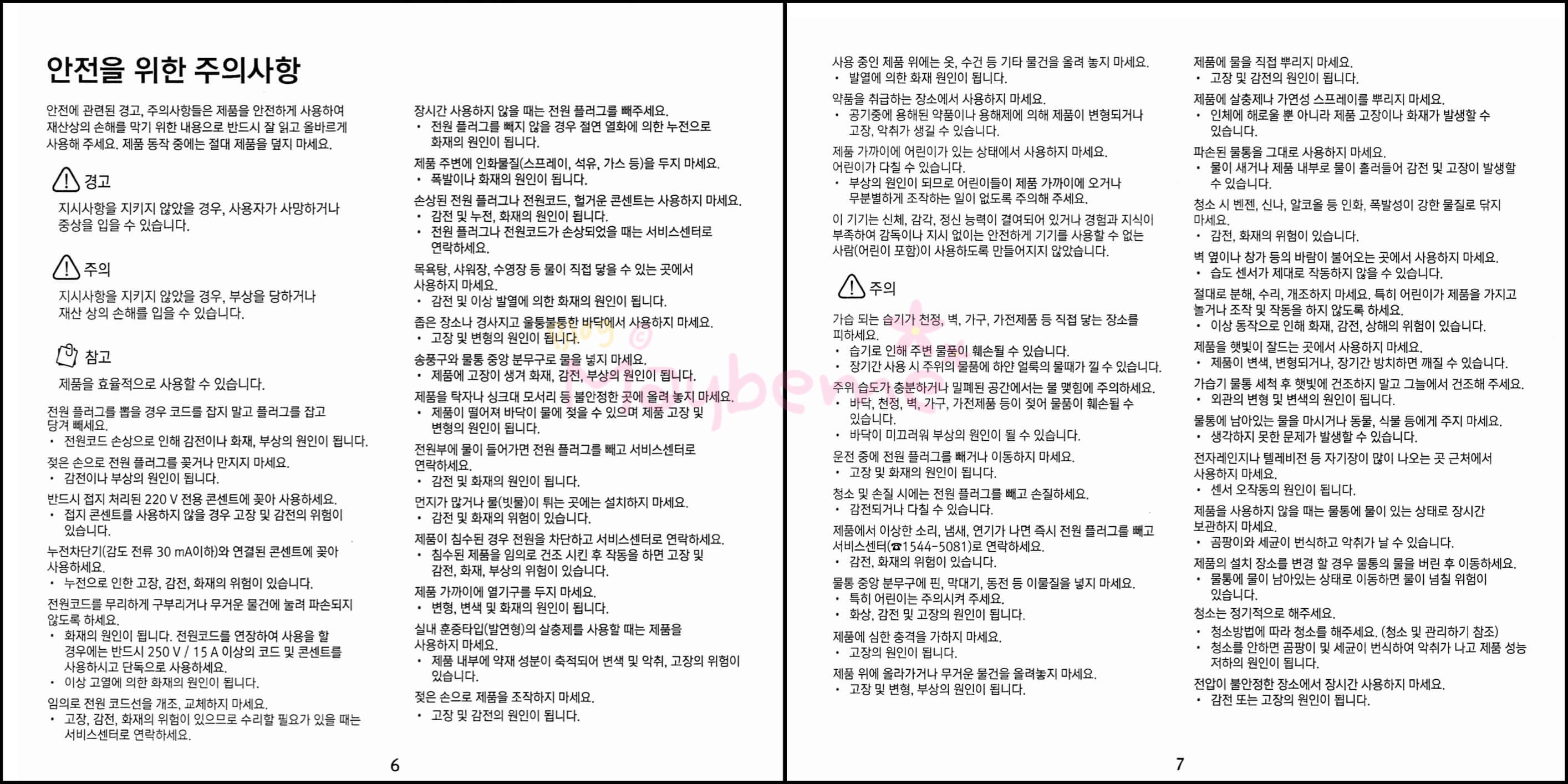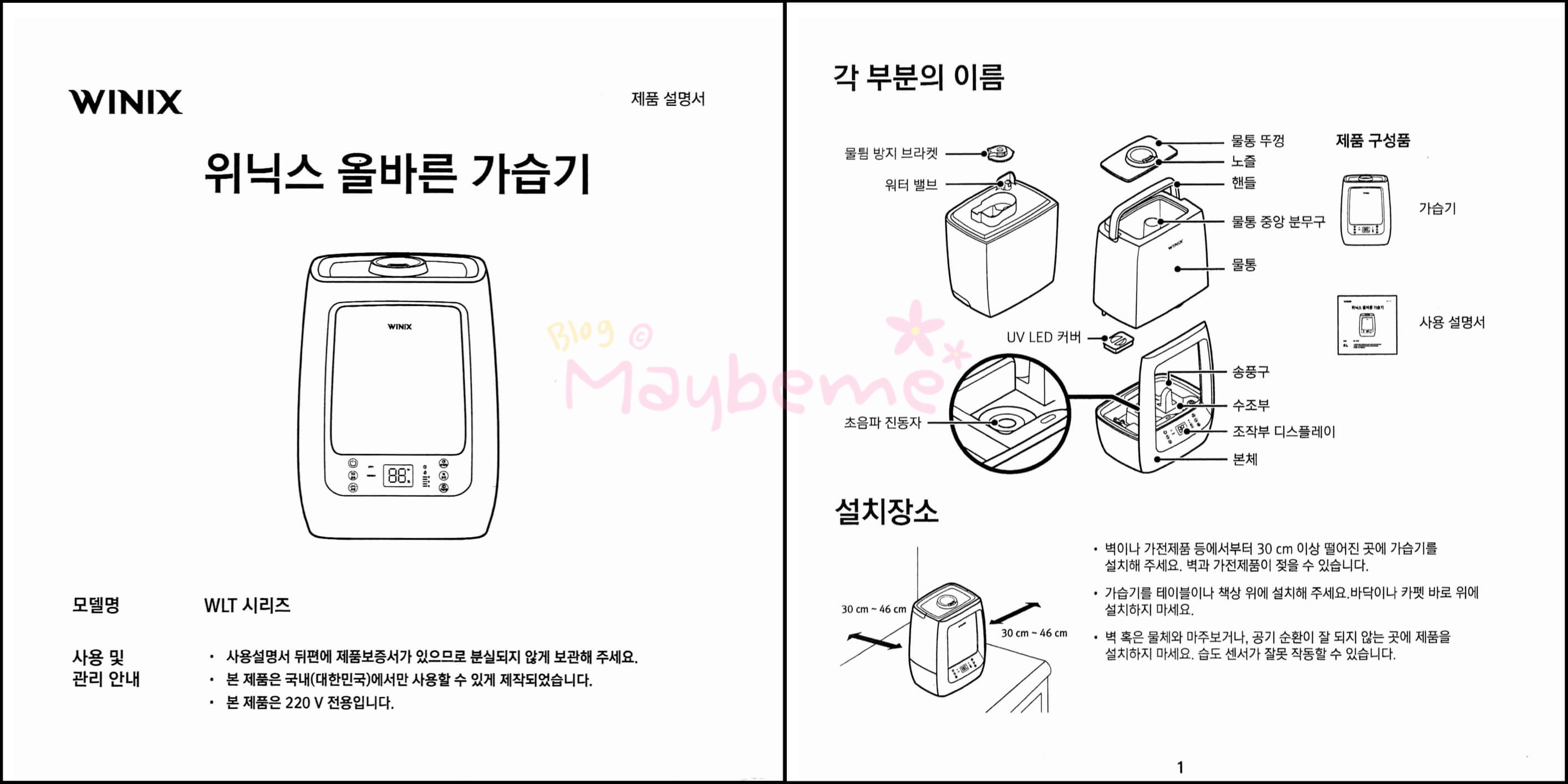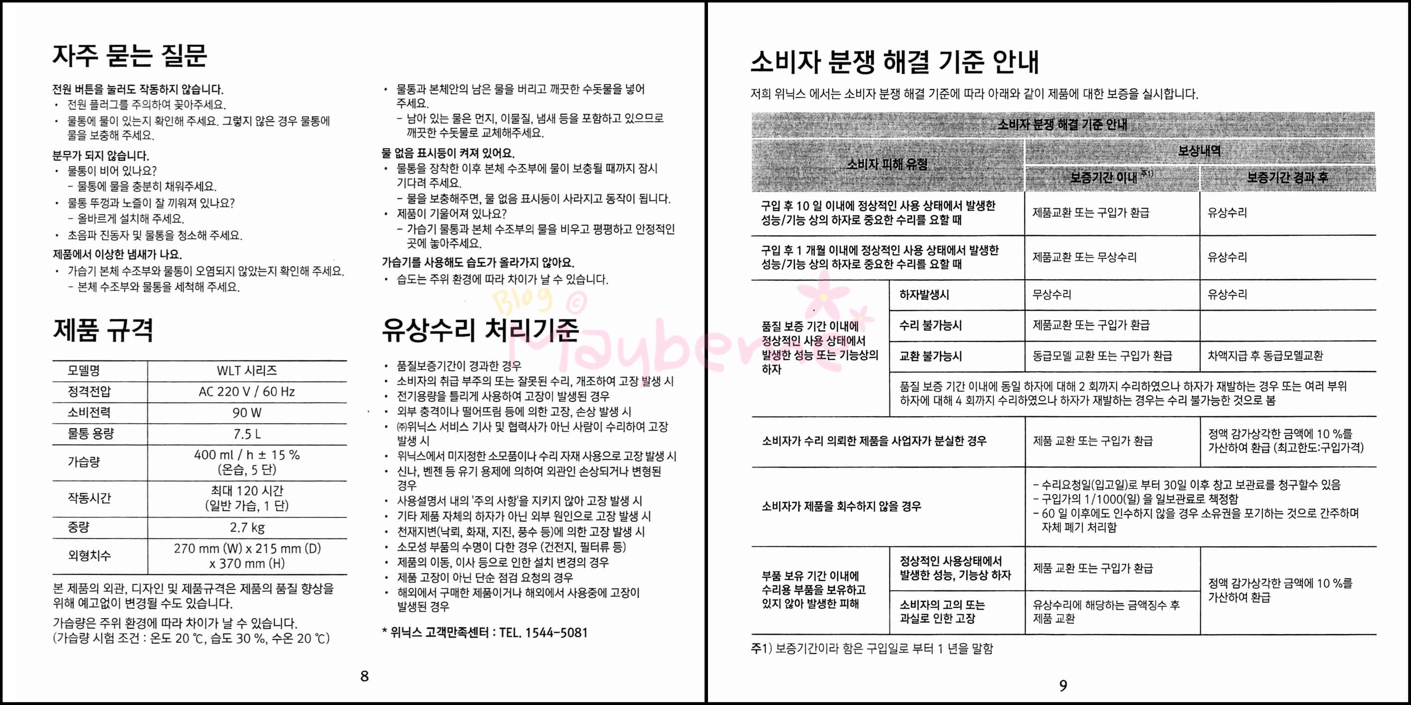 제품 구성으로는 가습기 본체 + 물통 + 물통 뚜껑 + 사용 설명서 이렇게 되어 있습니다. 사용설명서에는 제품보증서가 있어서 수리를 요할 때 꼭 제시하라고 되어있어서 버리면 안 될 것 같아요. 설명서도 올려봅니다.