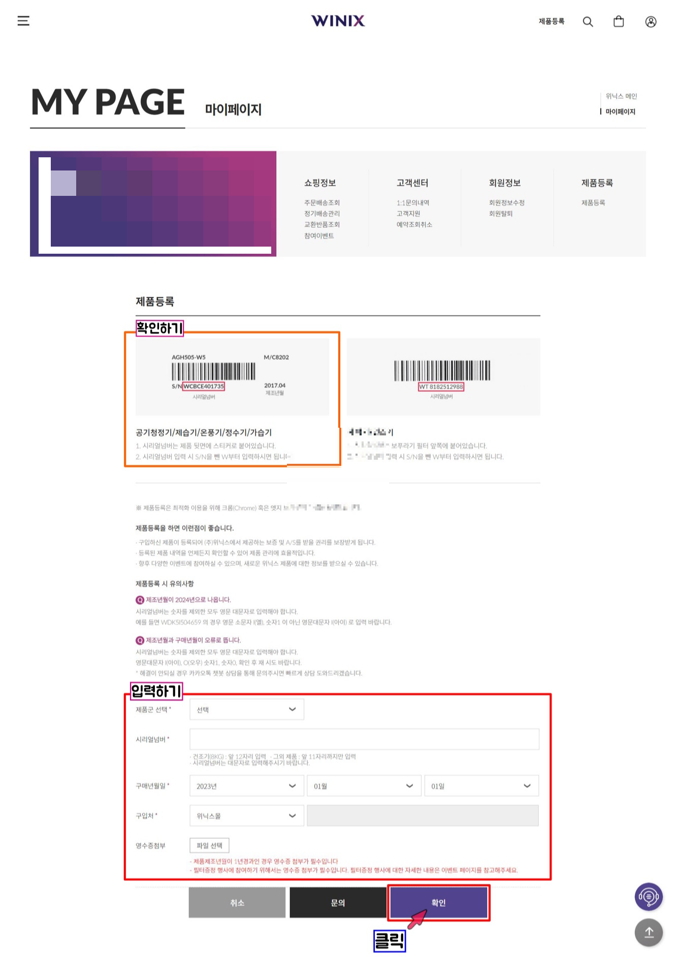 - 마이페이지 클릭 ▶ 아래 제품등록 클릭