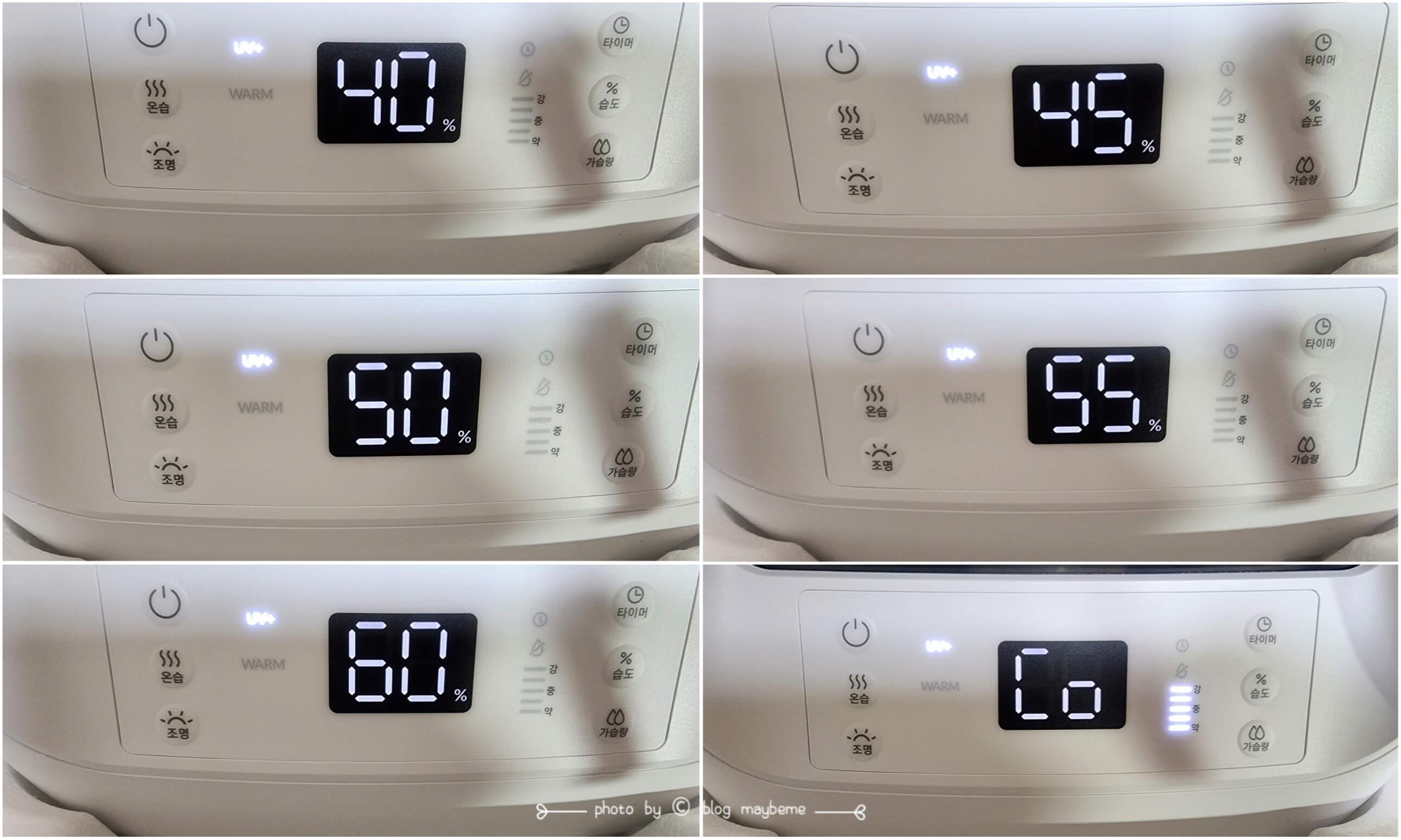 실내의 습도를 유지하는 것은 매우 중요한 부분 중 하나인 것 같아요. 구매하기 위해 검색하다 보니 욕심이 나는 기능 중 하니였어요. 사용해 보니 맞춰놓은 습도를 유지시켜 주는 기능 은근히 편리하고 좋은 것 같아요. 건조하지도 습하지도 않게 원하는 습도를 유지시켜 줌으로써 그 공간에서 오랫동안 지낼 때 중요합니다. 자동습도조절이 가능한 기능으로 습도가 높을 때는 분무가 되지 않고 습도가 낮아서 건조할 때는 분무가 되니까 습도유지를 할 수가 있어서 너무 좋은 것 같아요. 40% ~ 60% 까지 조절 정해 놓고 계속 나오게 하고 싶으면 CO로 맞춰놓으면 됩니다.