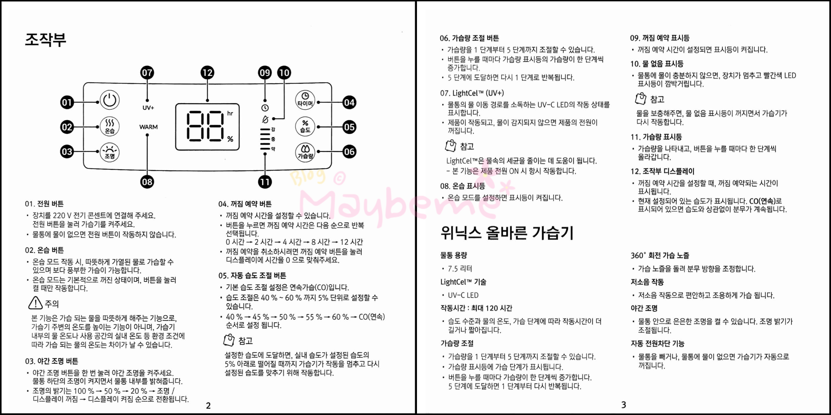 - 기본기능 : 습도조절 / 타이머 / 자동 꺼짐
