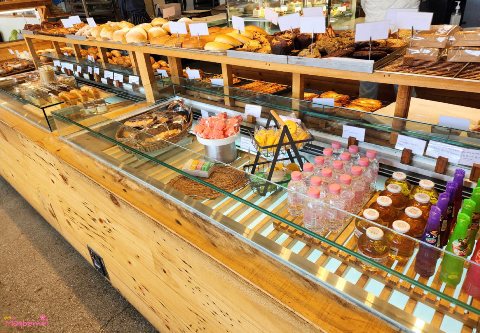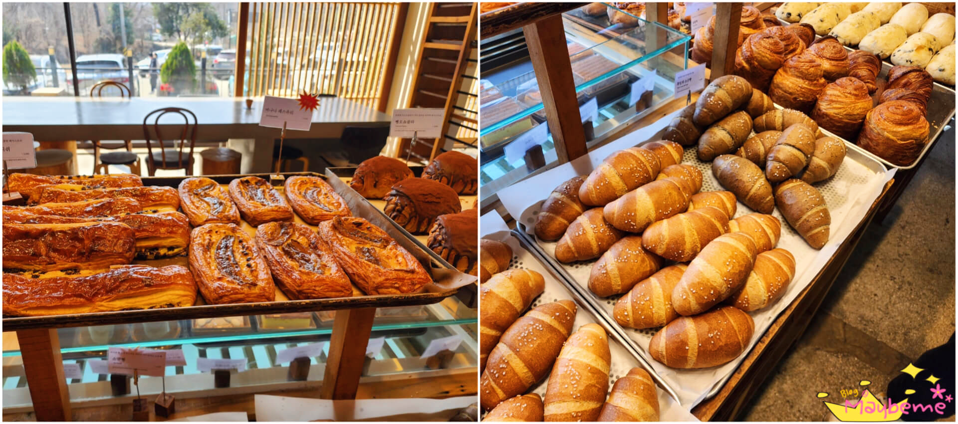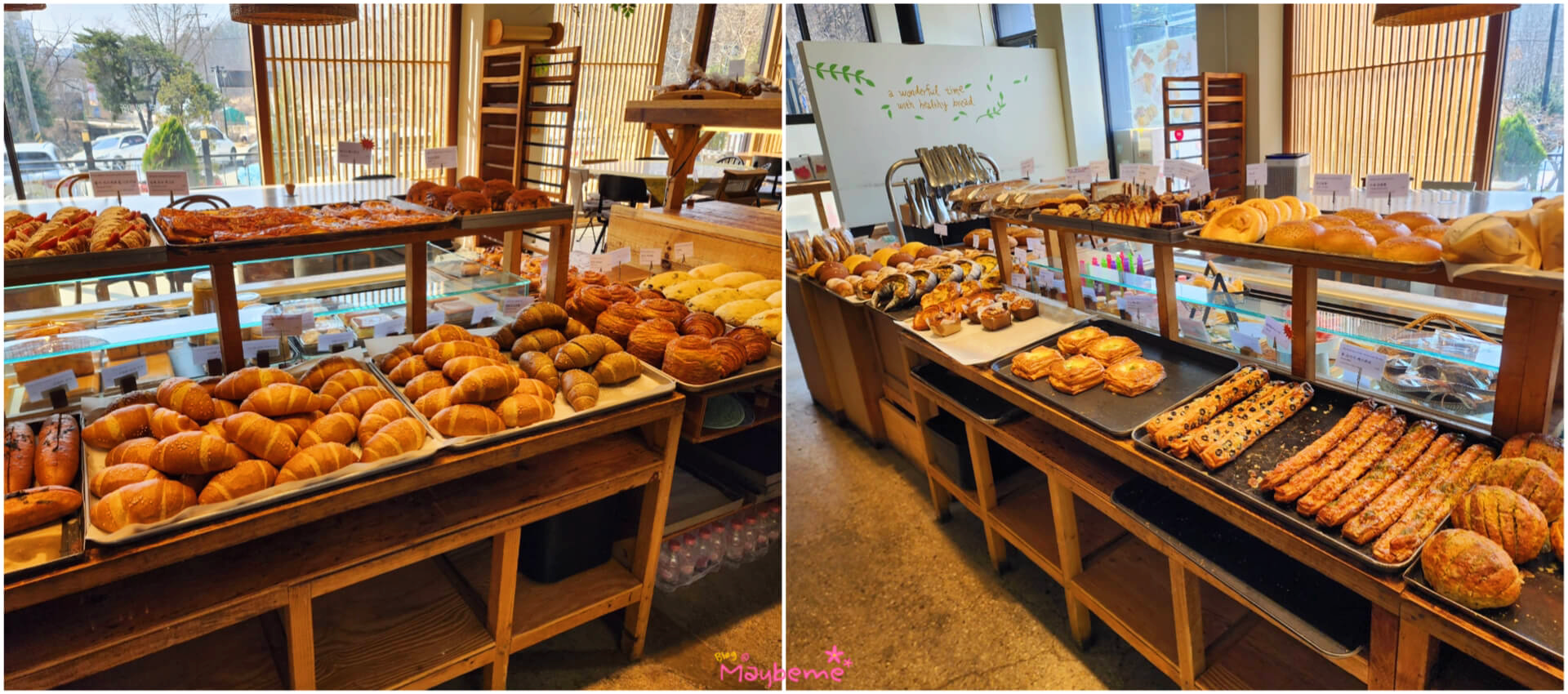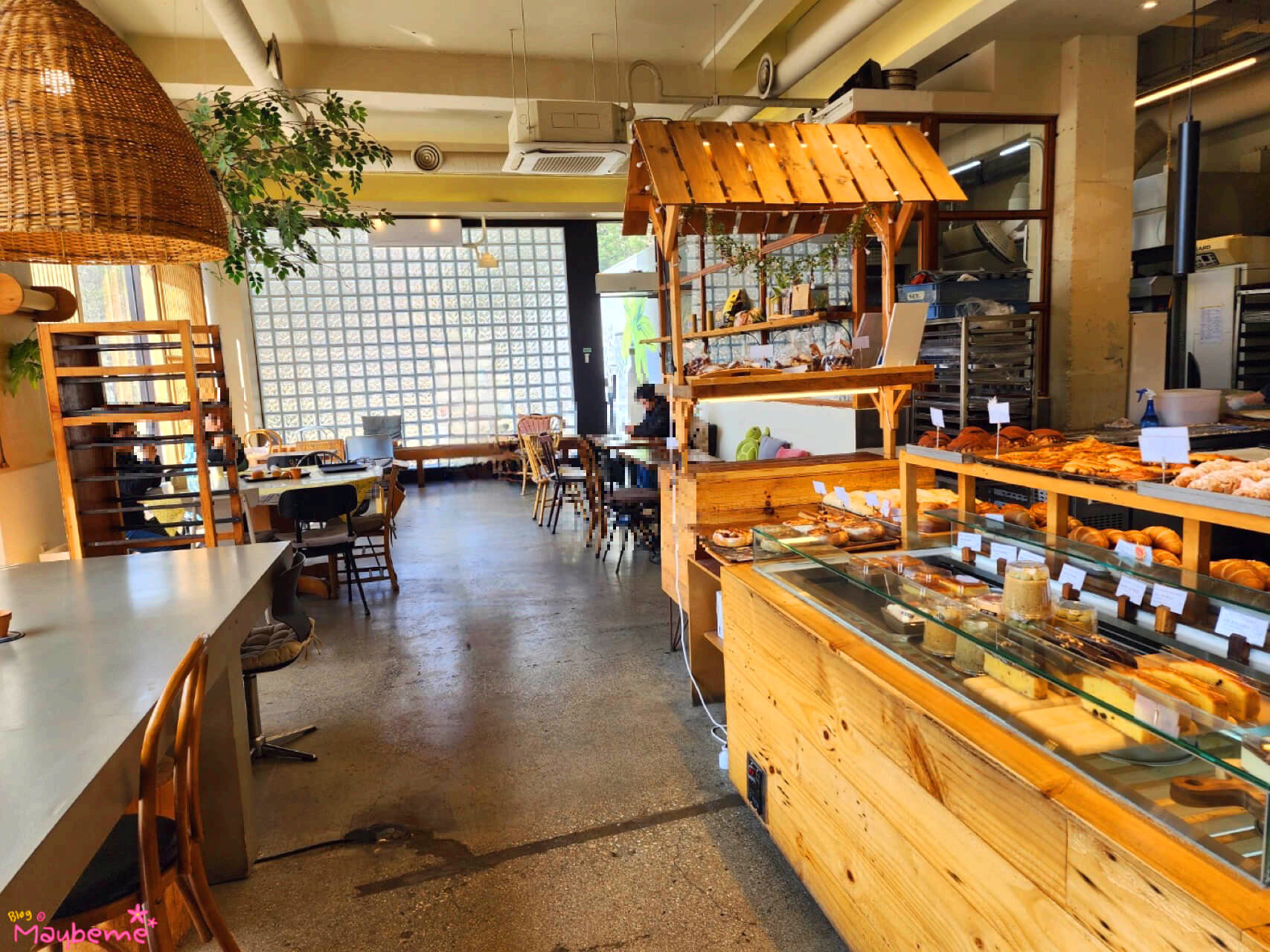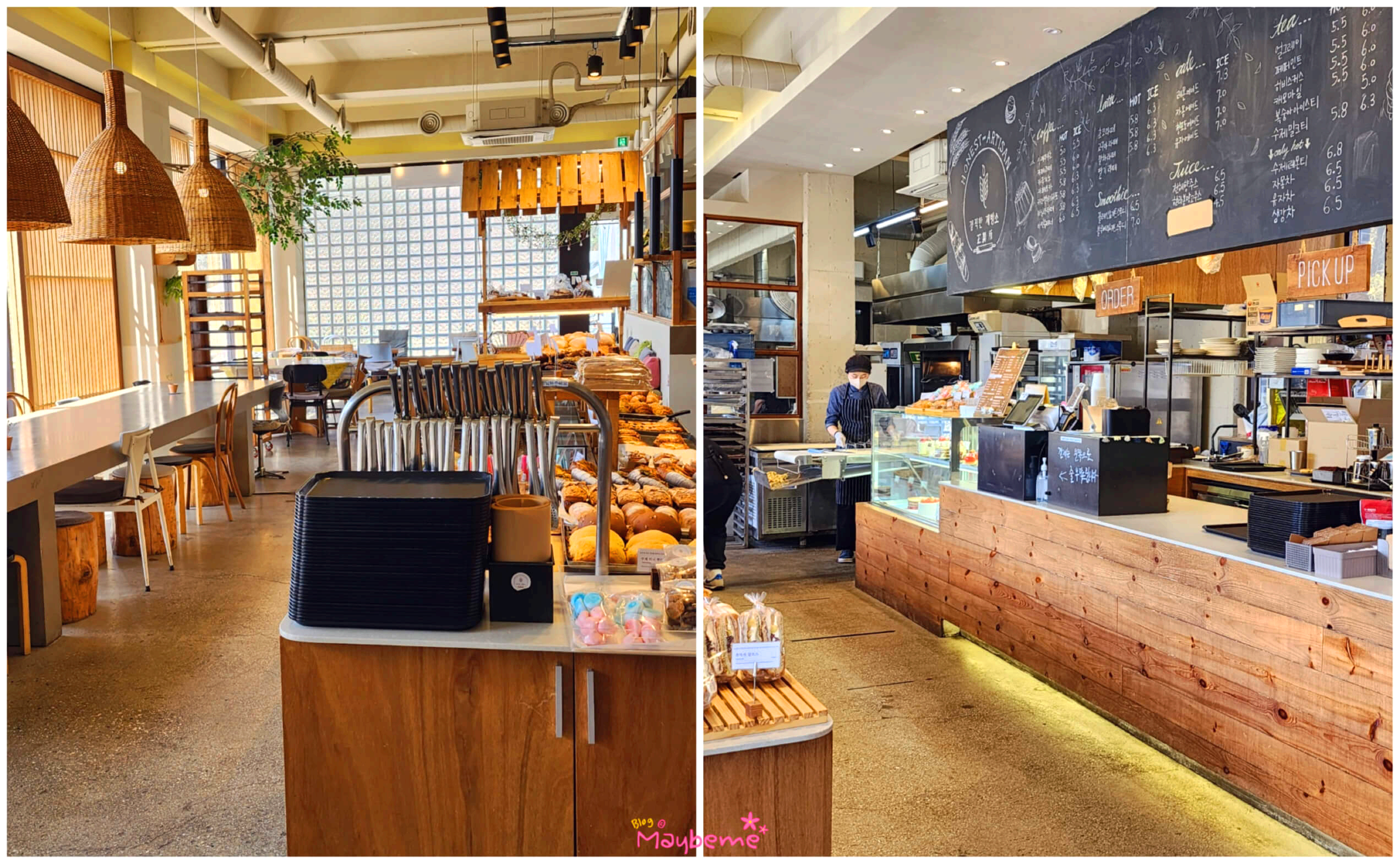 왼쪽으로 돌면 제일 먼저 보이는 건 먹음직스러운 빵 진열대가 있어요. 중앙 매대 양쪽으로 각종 빵들이 진열되어 있고, 빵이 나오는 시간대 한 12시쯤 가면 따끈한 빵들이 나와서 더 맛있게 먹을 수 있어요. 빵 진열대 양쪽으로 계산하는 곳과 빵을 먹을 수 있는 공간도 따로 있어요.