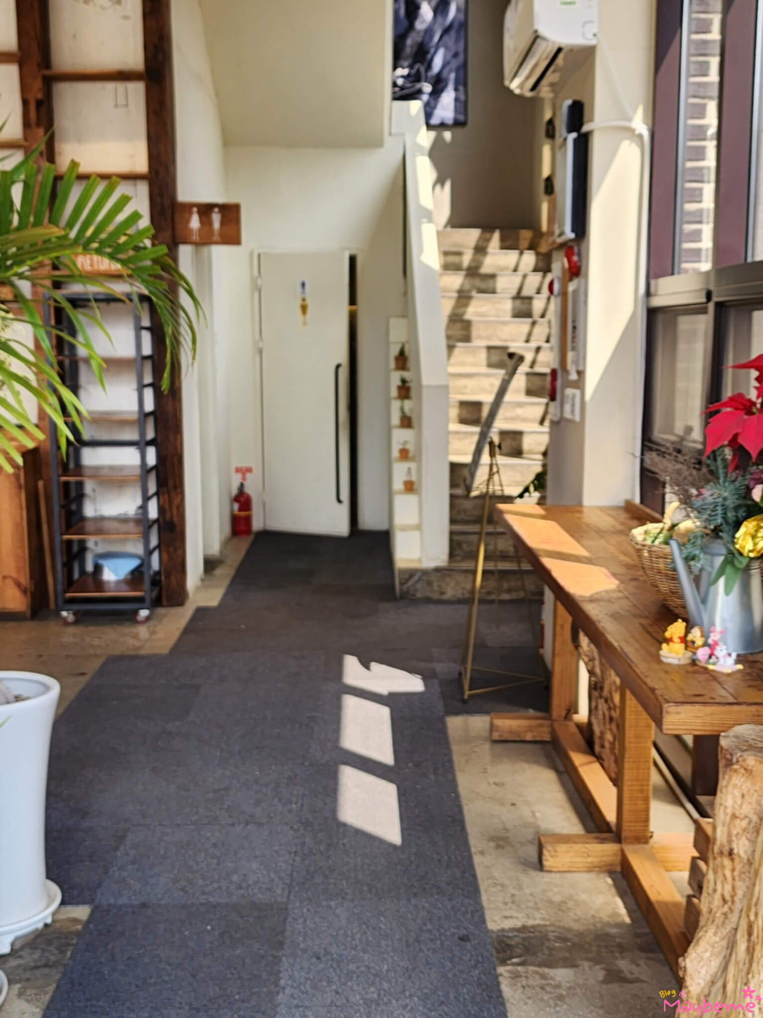 문을 열고 들어가면 2층으로 올라가는 계단이 있어요. 천장이 높고 조명이 은은해서 분위기가 좋아요. 곳곳에 식물 화분 등 인테리어 소품들이 놓여있어서 아늑한 느낌이 들기도 합니다.