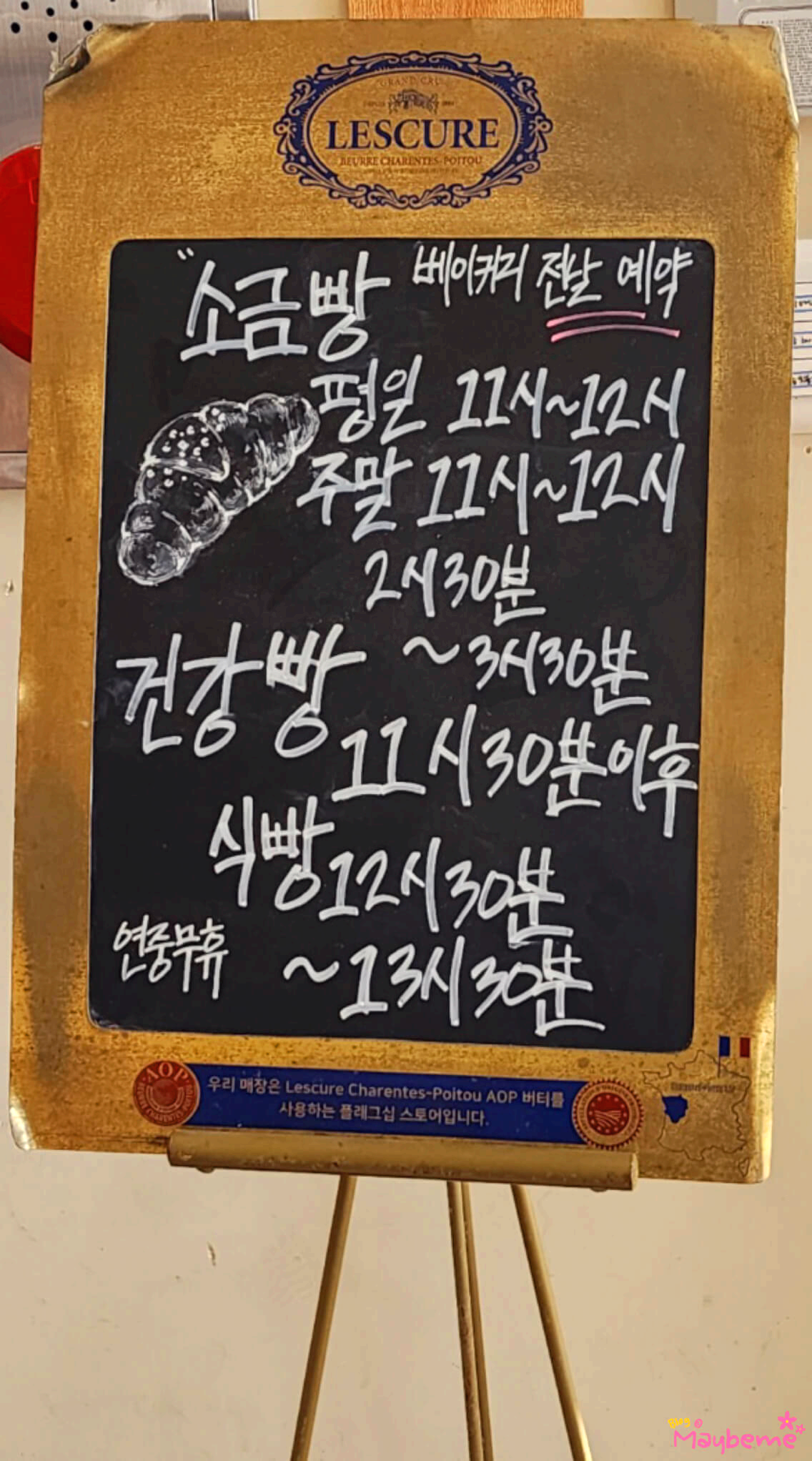 입구에 들어서면 볼 수 있는 공지판이에요. 베이커리 예약 할 수 있는 공지가 적혀 있어요. '정직한 제빵소'에서 는 프랑스에서 인증한 Lescure, AOP를 사용하고 있는 매장이라고 적혀있어서 안심이 돼요. 느끼하지 않고 버터의 고소한 풍미도 느껴져서 빵이 맛이 있어요.