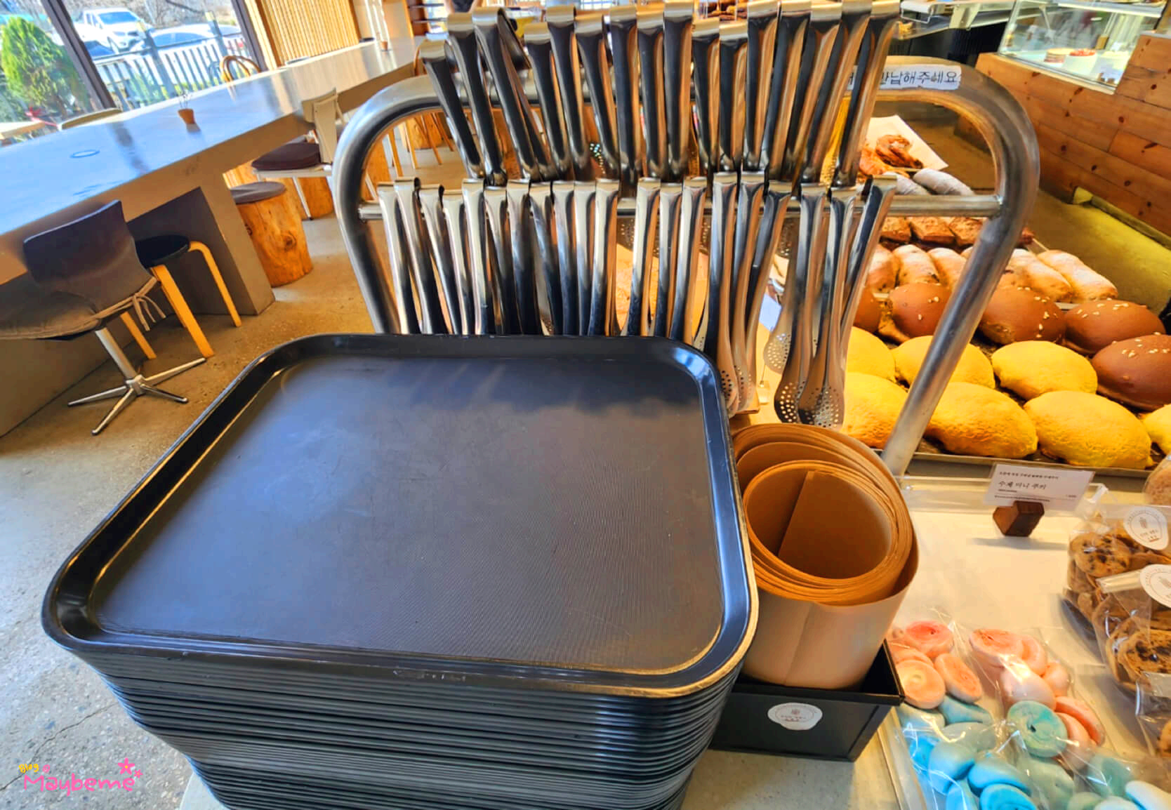 쟁반에 종이를 깔고 돌면서 빵을 골르면 되는데 사람이 많을 때면 품절되는 현상이 많이 있어요. 다행히 제가 갔을 때는 빵 나오는 시간대였고 사람들이 들어오기 시작하는 때여서 조금 천천히 돌면서 빵을 고를 수 있었어요.