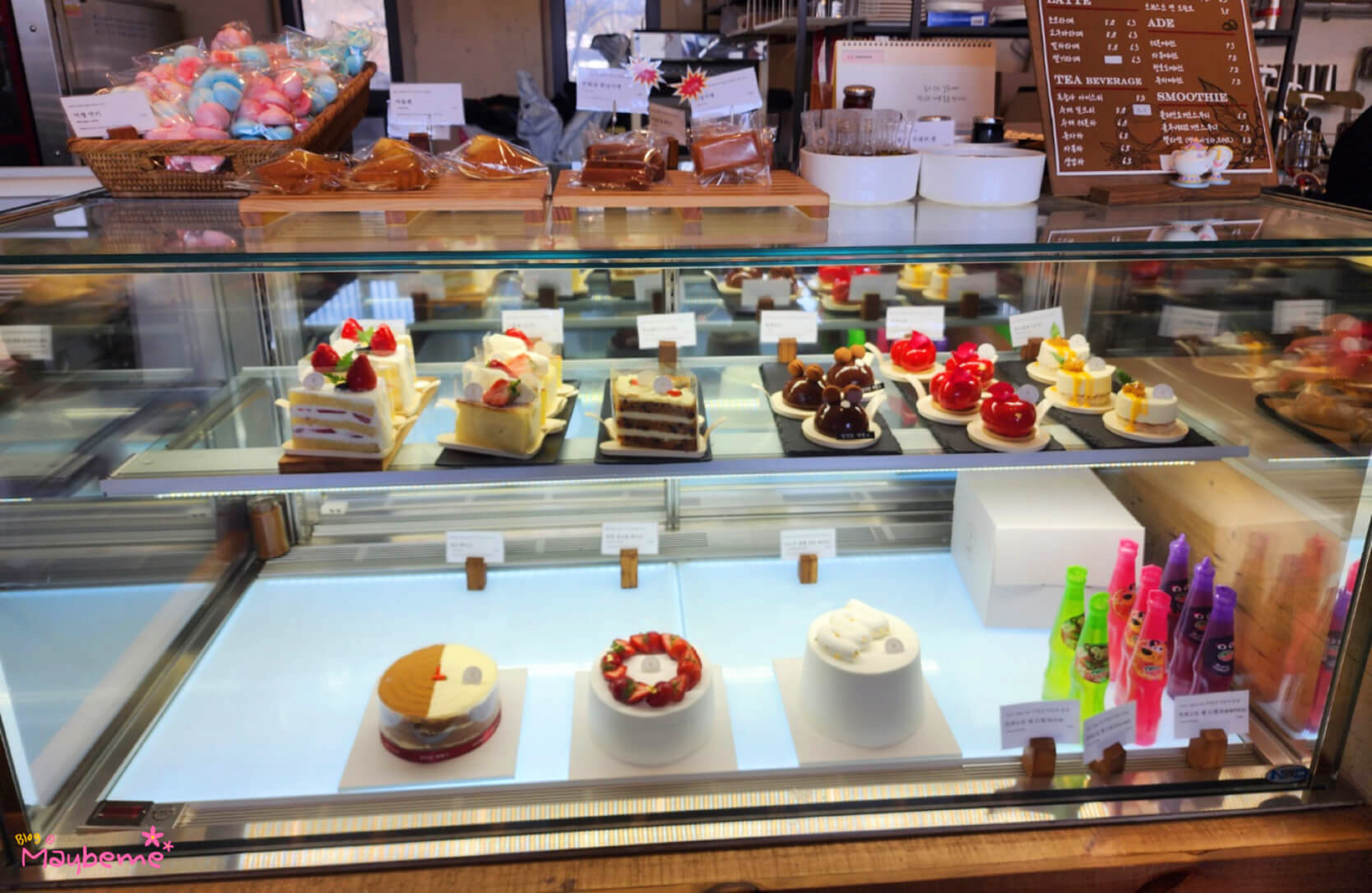 케이크나 타르트 같은 디저트류도 옆에 쇼케이스에 진열이 되어 있어요. 케이크 종류도 더 있는데 이번에는 3종류만 있었어요. 블루베리 케이크를 구매해서 먹었었는데 빵이 촉촉하고 맛있었어요.