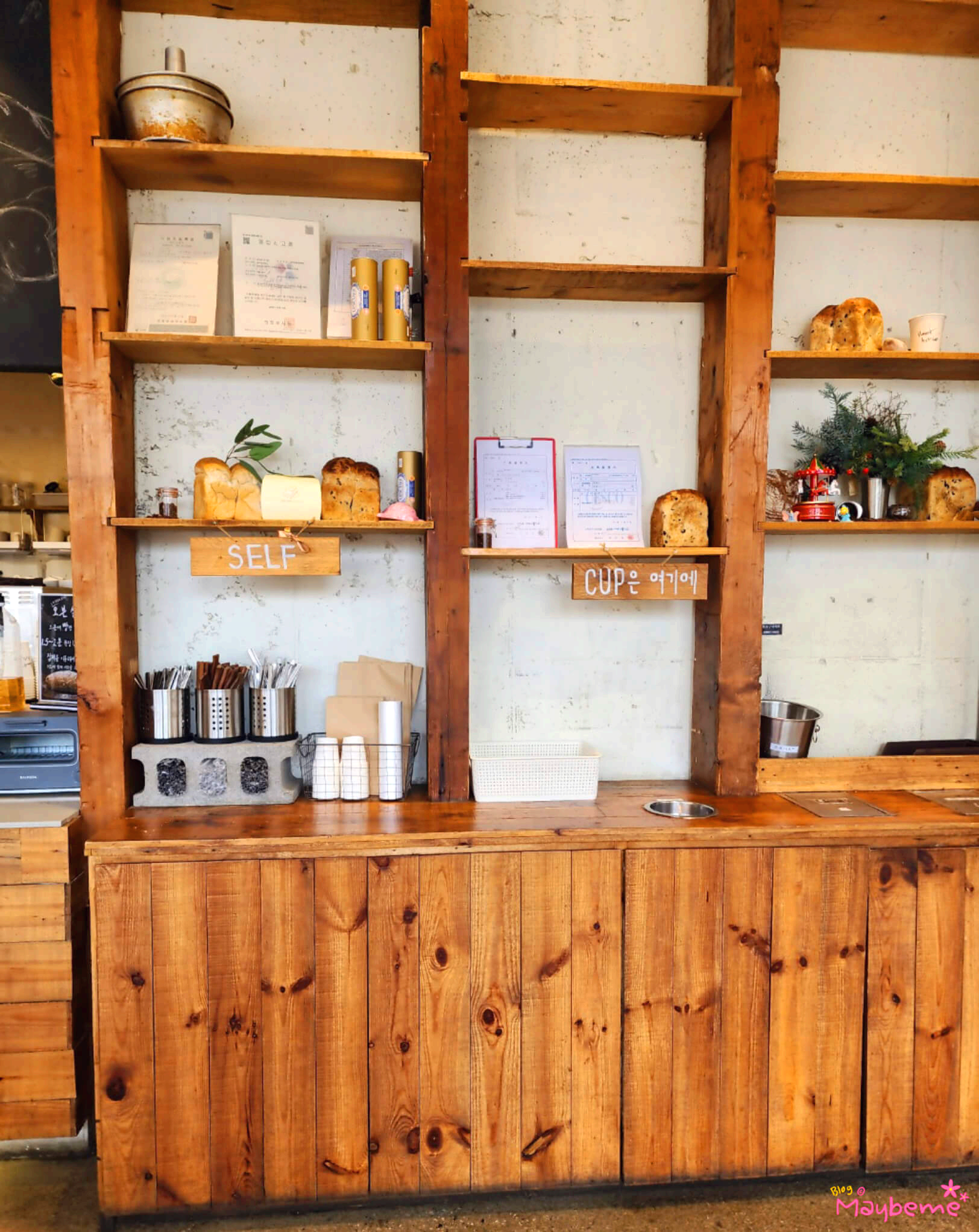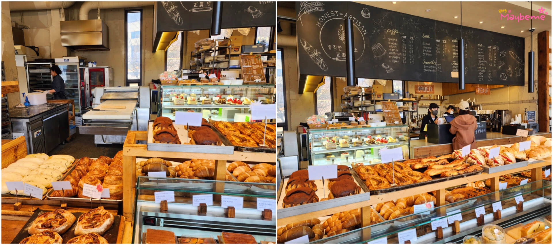 왼쪽으로 돌면 제일 먼저 보이는 건 먹음직스러운 빵 진열대가 있어요. 중앙 매대 양쪽으로 각종 빵들이 진열되어 있고, 빵이 나오는 시간대 한 12시쯤 가면 따끈한 빵들이 나와서 더 맛있게 먹을 수 있어요. 빵 진열대 양쪽으로 계산하는 곳과 빵을 먹을 수 있는 공간도 따로 있어요.