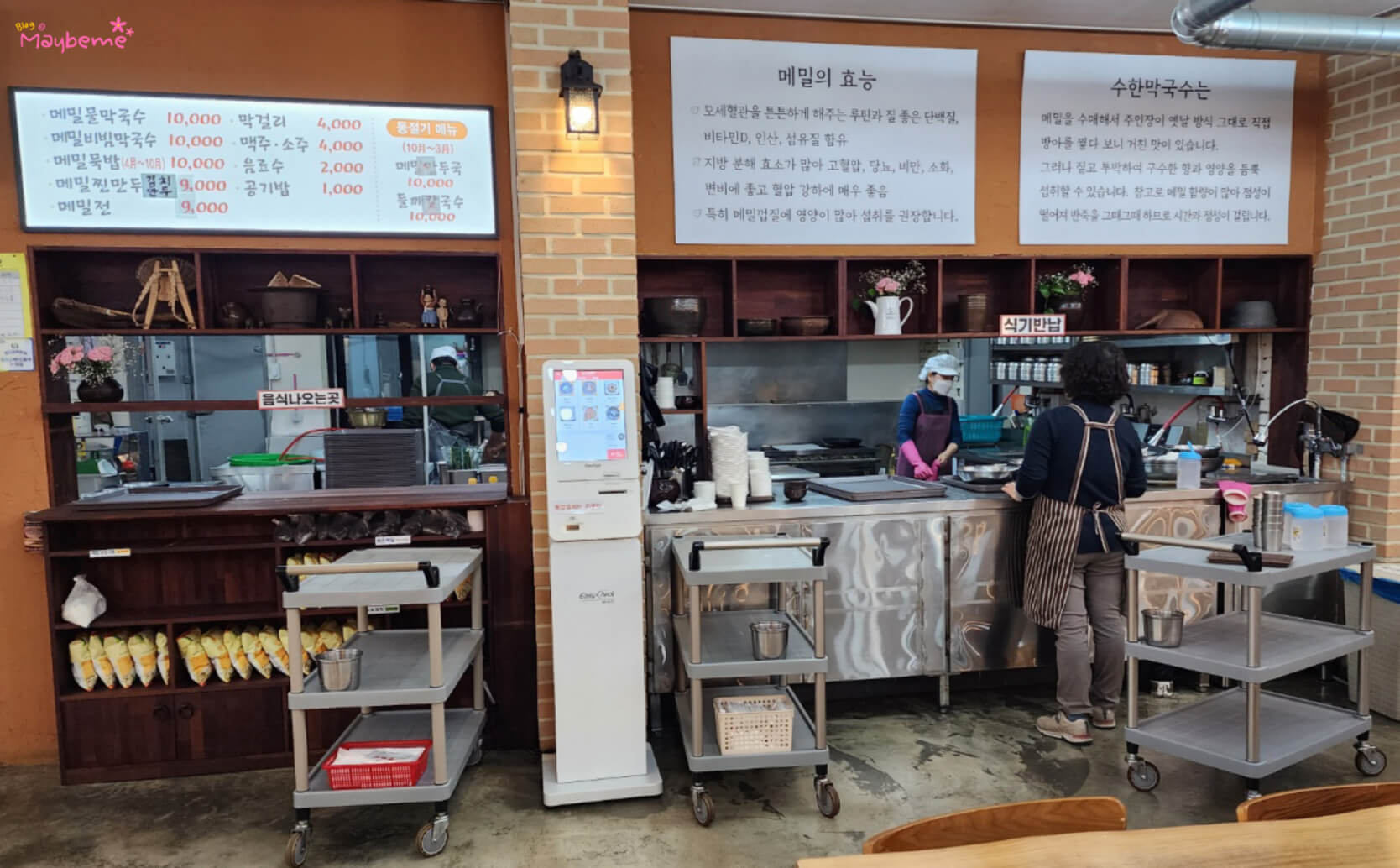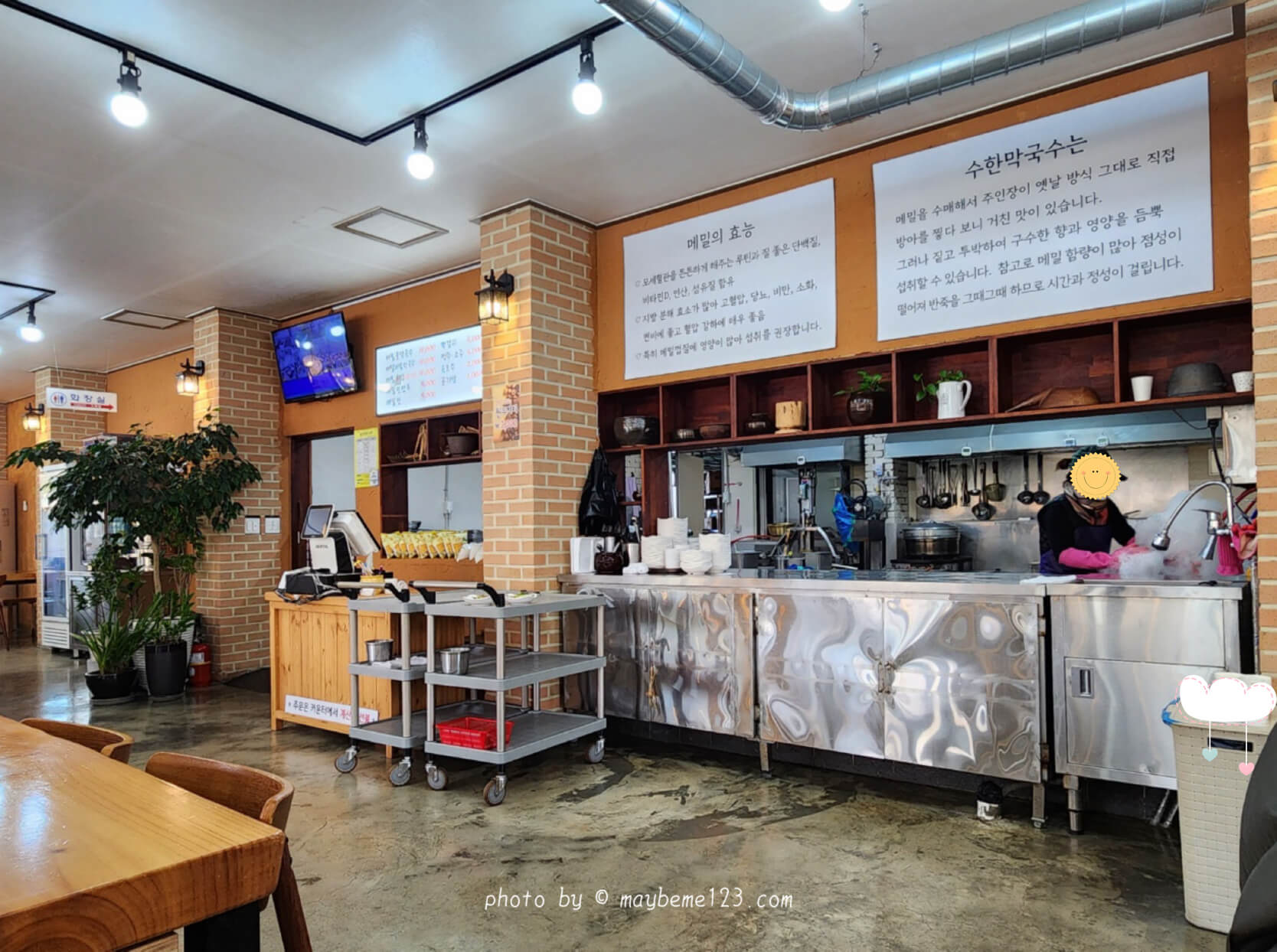 주방 쪽에 메밀의 효능과 수한 막국수에 대해 적혀 있어요. '메밀의 효능'은 모세혈관을 튼튼하게 해 주는 루틴과 단백질, 비타민D, 인산, 섬유질 함유, 지방 분해 효소가 많아 고혈압, 당뇨, 비만, 소화, 변비에 좋고 혈압 강하에 좋다고 해요. 메밀껍질이 거칠긴 하지만 영양이 많아 섭취를 권장한다고 합니다. 수한 막국수에 대해도 적혀있었어요.