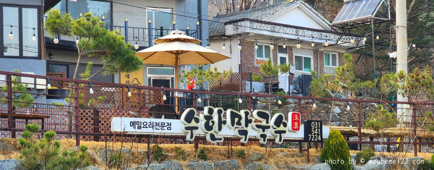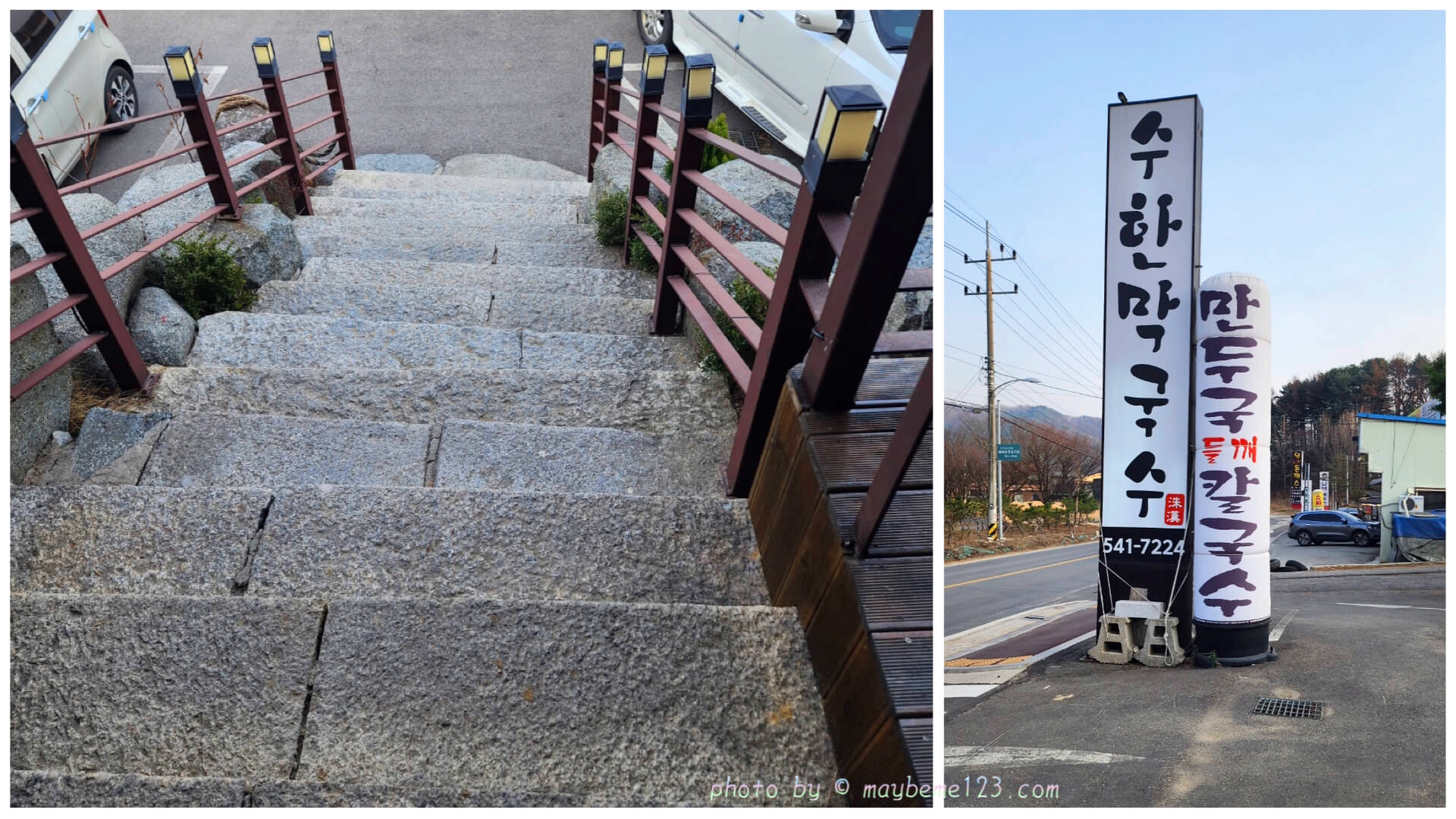 올라가는 계단은 돌로 되어 있고 높이 있어요. 비 올 때는 살짝 긴장은 되긴 하지만 그래도 돌계단이 예쁜 것 같아요. 주차장 쪽으로 들어올 때 크게 수한 막국수라고 적혀있는 간판이 있어서 찾는 것도 어렵지 않고 들어올 수 있어요.