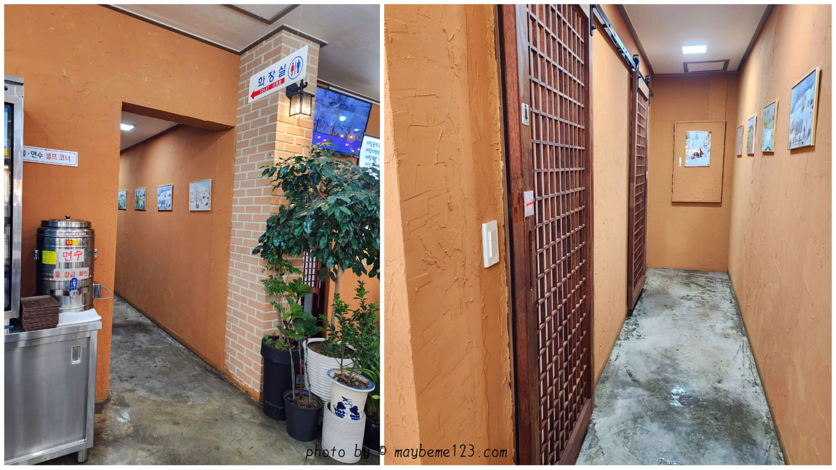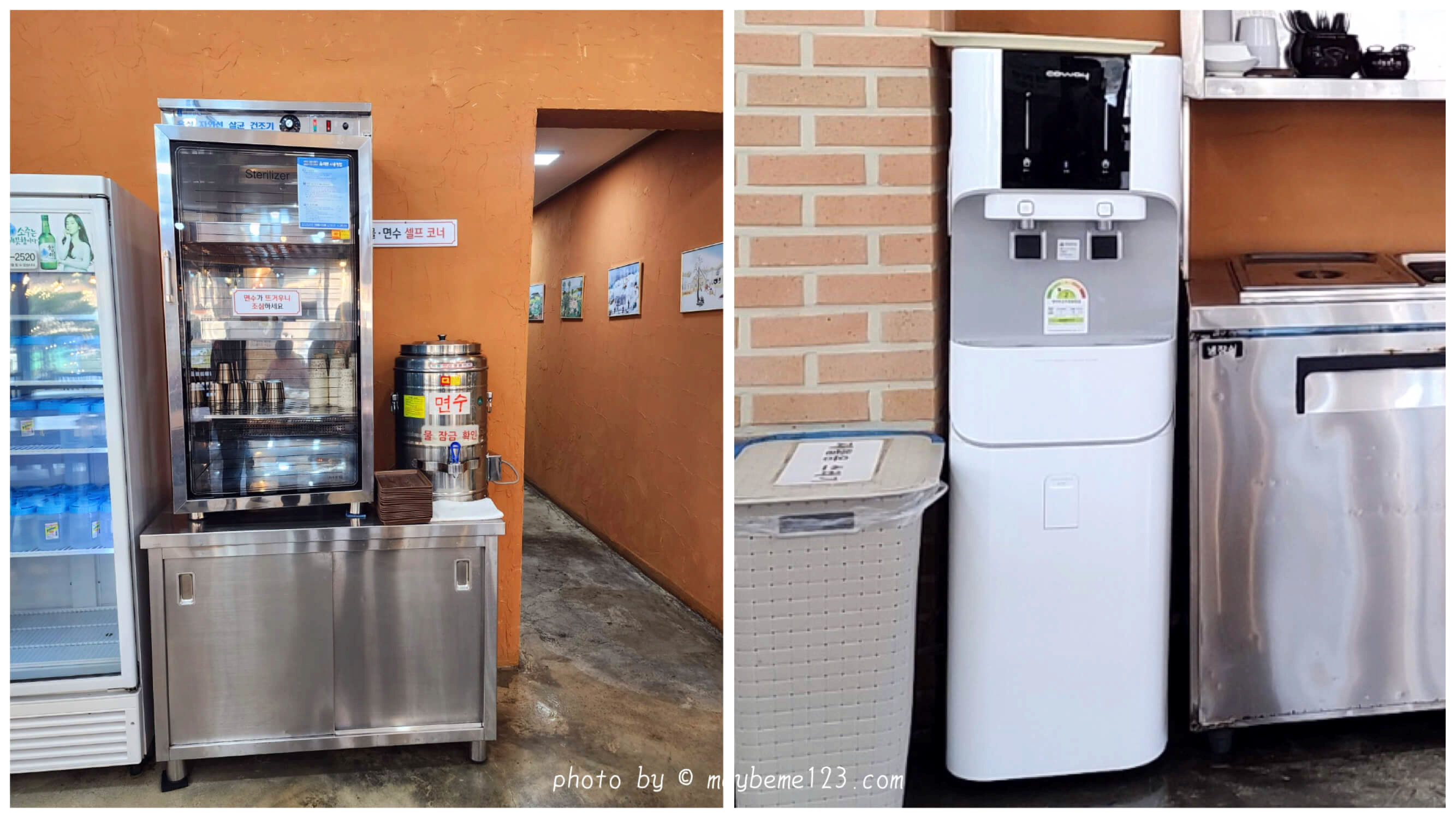 물과 면수는 셀프로 떠와야 합니다. 물은 반찬 뜨는 곳 옆에 정수기가 있고 물통은 면수 있는 곳에 있어요. 면수는 화장실 쪽에 뜨거운 면수와 물컵이 있어요. 물컵은 종이컵과 스텐컵 두 종류로 되어 있어서 선택이 가능합니다.