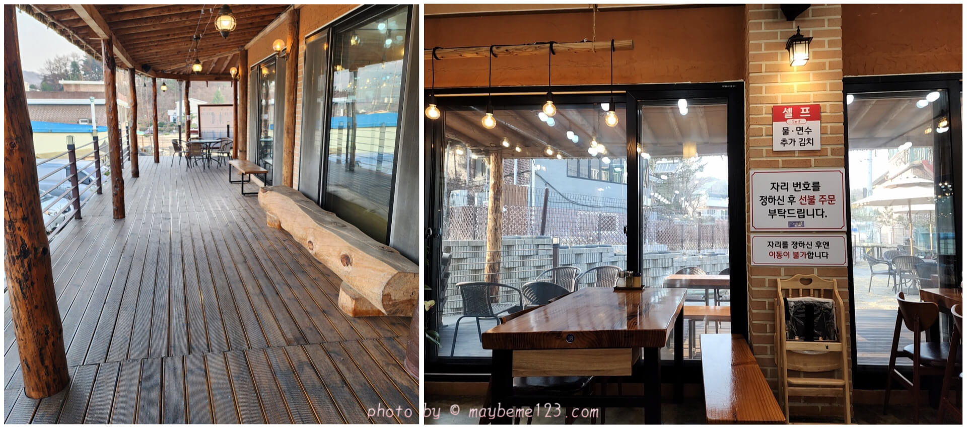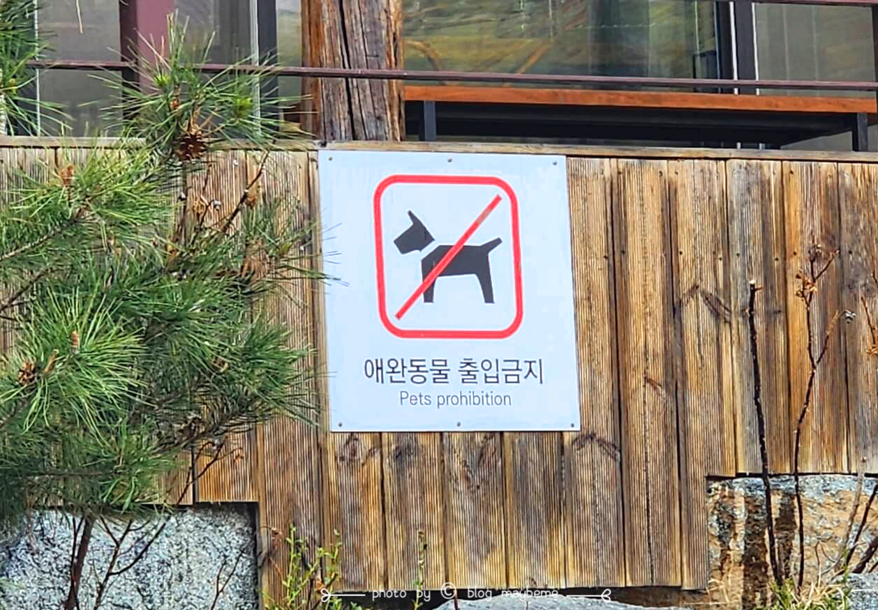 애완동물 출입금지라고 크게 적혀있는 경고판이 붙여 있어요. 계단을 올라오면 테라스가 넓게 있어요. 양쪽으로 갈 수 있고 밖에서 대기하는 곳이나 쉬는 공간인지 공간이 넓게 있더라고요. 카페처럼 되어 있어요.