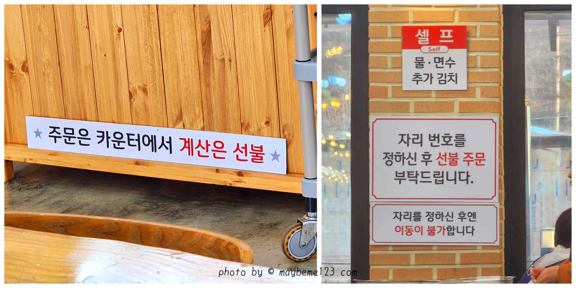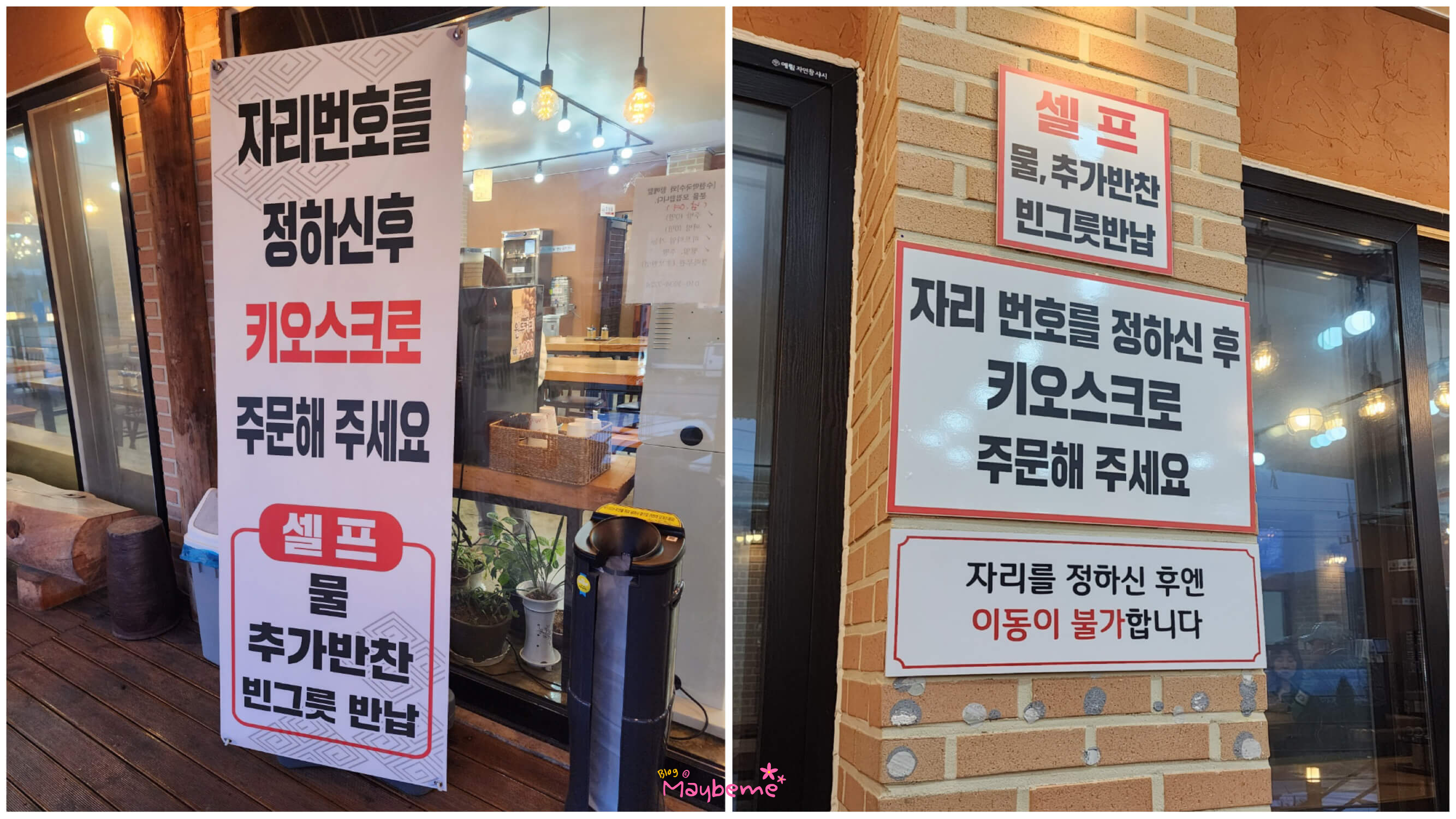결제하는 방식이 바뀌었어요. 들어가는 입구에 스탠드 현수막에 '자리번호를 정하고 '키오스크'로 주문해 주세요'라고 적혀 있었어요. 예전과 동일한 부분은 자리를 정한 후에는 이동이 불가하다는 거예요.