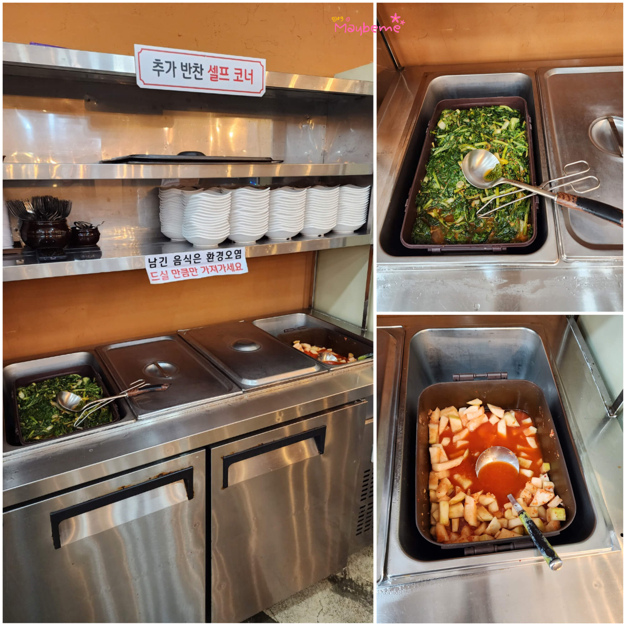 반찬은 기존과 동일하게 셀프로 떠와야 해요. 열무김치는 음식 나올 때 같이 나와요. 무김치는 직접 떠와야 해요. 반찬과 물은 바뀌지는 않았지만 새롭게 사진을 찍어서 추가해서 올렸습니다.