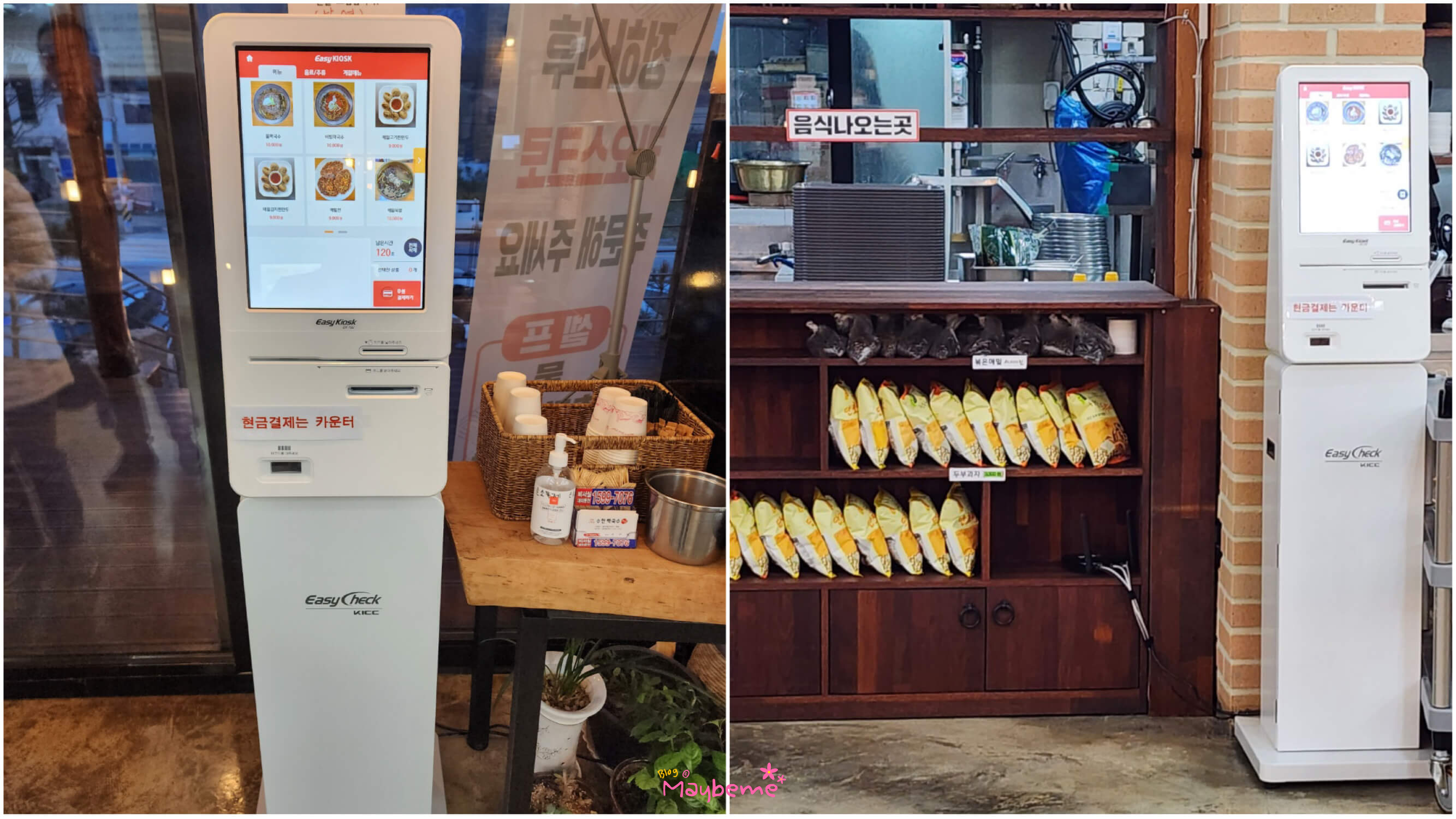 결제하는 키오스크는 출입구 옆에 1대 맞은편 주방 쪽에 1대 이렇게 총 2대가 있어요. 현금 결제는 카운터에서 하면 된다고 합니다. 카운터는 주방 쪽 키오스크에서 좀 떨어져 있는 카운터가 있어요. 키오스크를 이용해서 결제하는 방식이 최근에 도입된 것 같아요. 저희 다음으로 들어오신 분들이 많았는데 은근히 헷갈려했어요. 결제를 안 하고 카운터 앞에 계속 서있으신 분들도 많이 계시더라고요. 직원분이 키오스크로 결제해야 한다고 여러 번 말하더라고요. 아무튼 결제는 화면에 나와있는 메뉴를 선택하고 정한 자리의 테이블 넘버를 눌러주면 결제할 수 있어요.