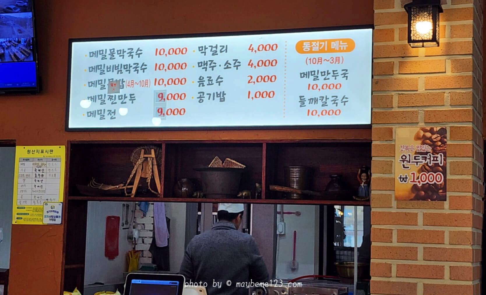 주문은 카운터에서 하기 때문에 메뉴판은 따로 주지 않고 카운터 쪽에 있는 메뉴판을 보고 주문을 해요. 저희는 '메밀 비빔막국수'를 주문했어요. 메밀만둣국과 들깨칼국수는 동절기에만 주문이 가능해요.