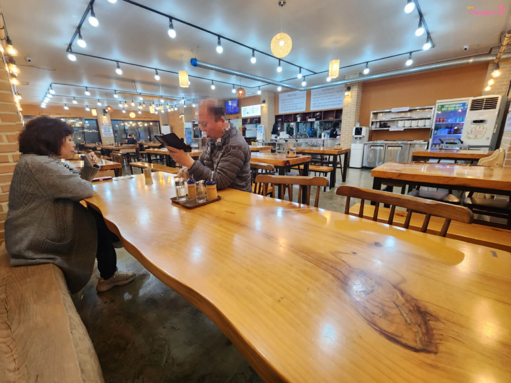 식단 내부는 넓고 테이블에 앉아 식사하는 곳이에요. 예전에는 바닥에 앉는 곳이 있었는데 가게 공사하고 나서는 다 테이블에 앉아 식사하는 곳으로 되어있어요. 안쪽에는 큰 난로가 있는데 은근히 내부 인테리어랑 어울리더라고요. 주문은 카운터에서 하고 계산은 선불이에요. 벽에 공지가 붙어있는데 '자리 번호를 정한 후 선불 주문'하라고 적혀있어요. 그리고 '자리를 정한 후에는 다른 테이블로 이동이 불가'하다고 하네요. 테이블마다 번호가 붙여 있어요. 저희는 19번 테이블에 앉았습니다.^^ (맨 밑에 바뀐 정보를 참고)