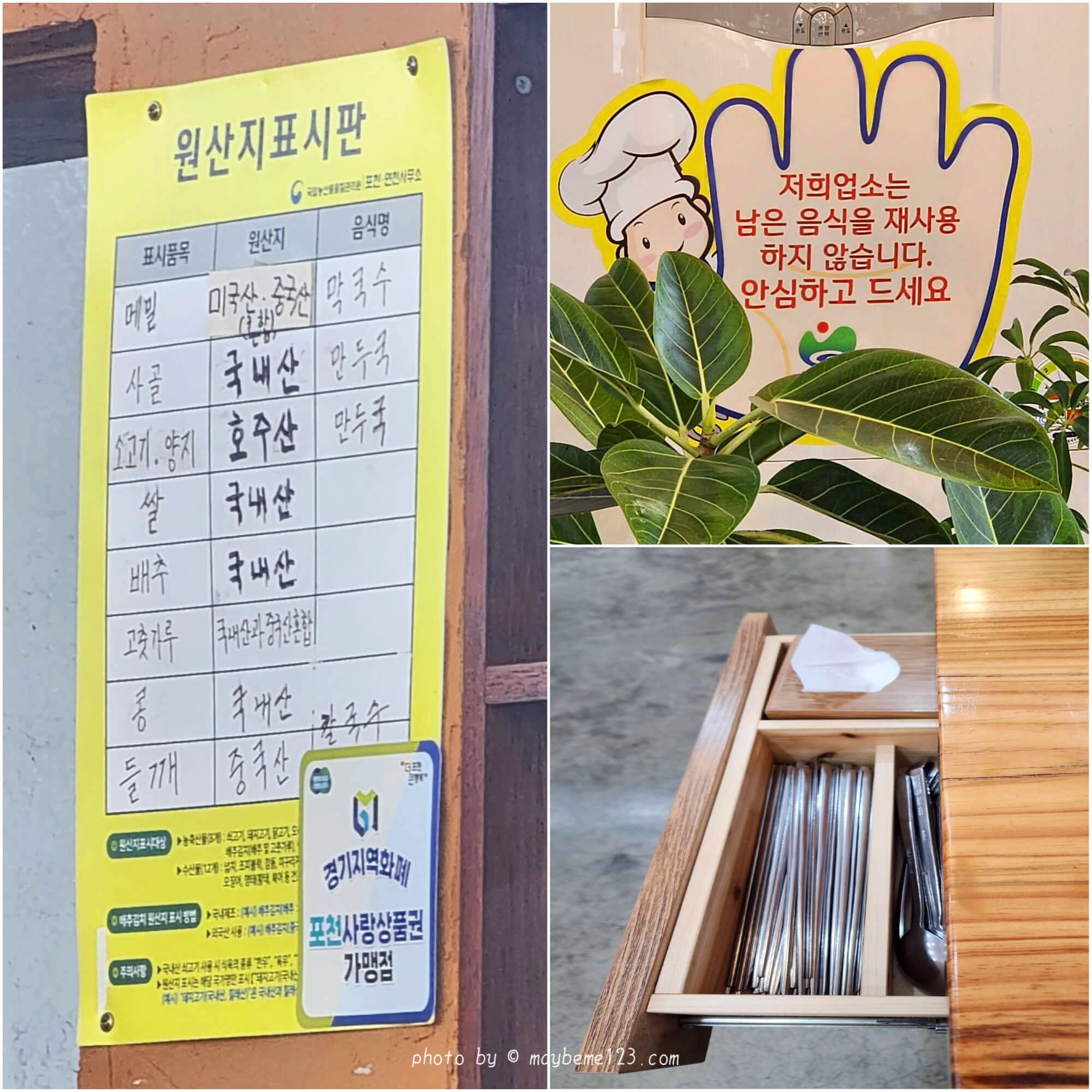 원산지 표시판도 붙어 있어요. 메밀의 원산지는 미국산과 중국산 혼합이라고 적혀있네요. 남은 음식은 재사용하지 않는 식당이어서 안심하고 먹을 수 있어요. 수저와 티슈는 테이블 옆에 서랍을 열면 있어요. 근데 뻑뻑해서 열 때마다 놀라긴 했어요.