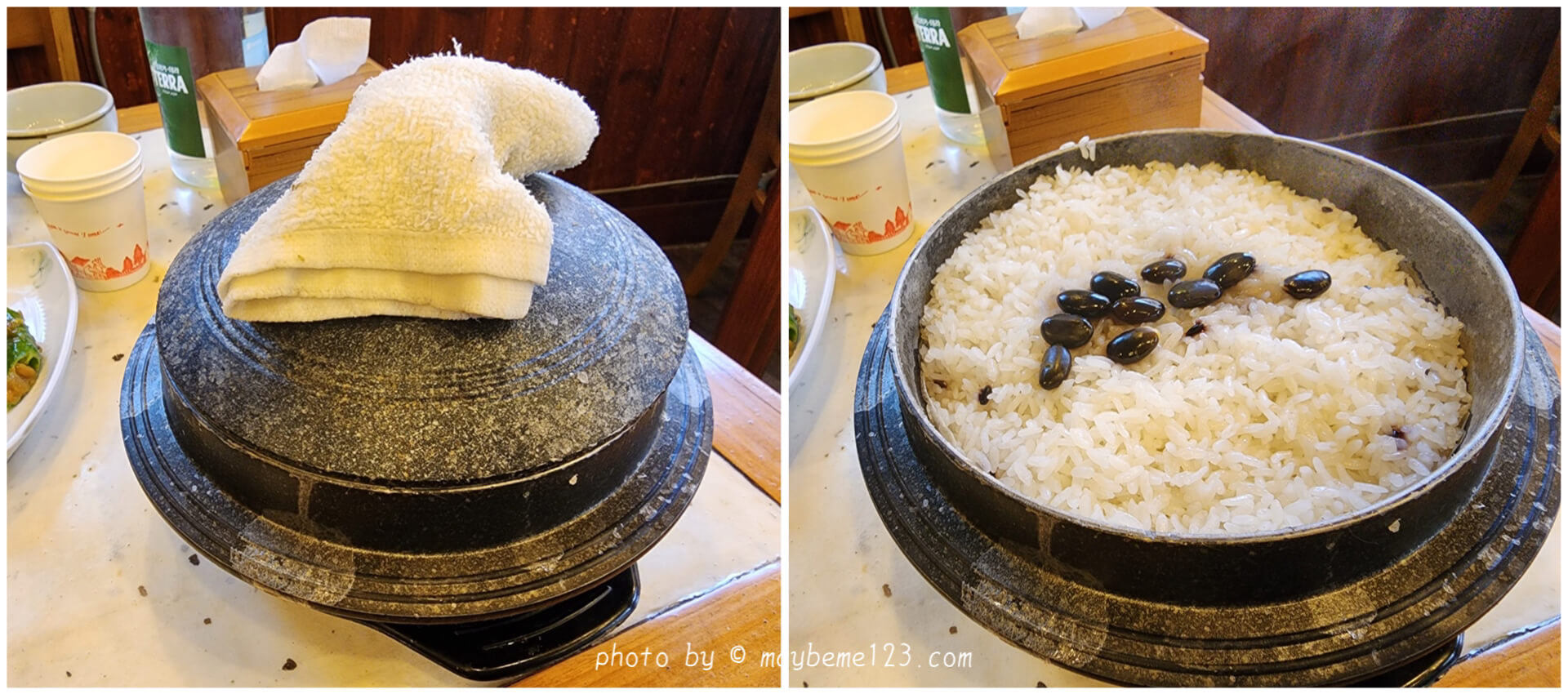 식당 안으로 들어가면 계산하는 카운터와 왼쪽으로는 룸으로 들어가는 곳이 있고 오른쪽으로는 테이블에 앉아서 식사하는 곳으로 되어 있어요. 룸 형태의 자리는 바닥에 앉아서 식사하는 곳이에요. 저희는 룸 형태의 자리도 이용하지만 주로 테이블에 앉아서 식사하는 곳을 이용해요.