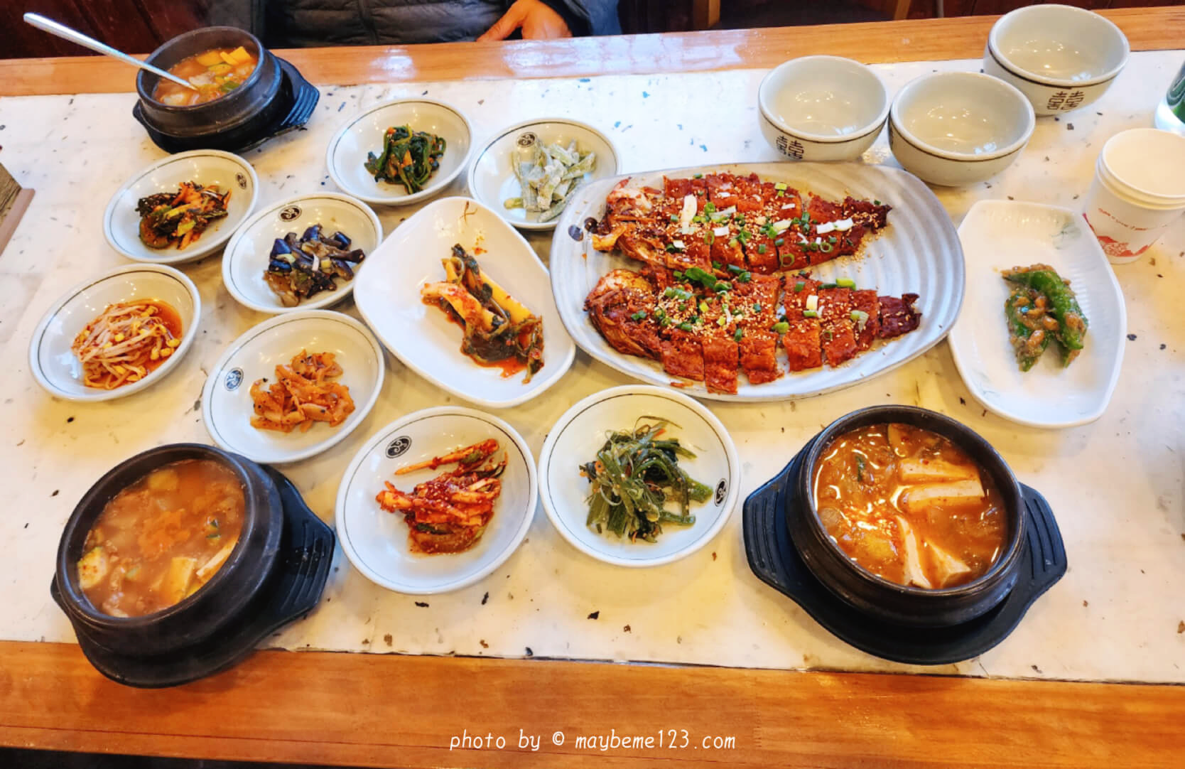 메뉴는 단일메뉴 '황태구이' 정식 한 가지 있어서 식당에 들어가면 따로 주문을 받지 않고 인원수만 묻는 것 같아요. 메뉴판은 따로 주지 않아요. 가격은 1인분에 14,000원➡️ 15,000원이에요. 밥은 인원수에 맞게 한 솥에 담아져서 나와요. 밥을 뜨고 나면 사장님이 다시 가져가서 누룽지를 끓여서 다시 줍니다. 솥밥을 줄 때 물을 붓지 말라고 안내해 주세요. 반찬은 리필해 달라고 말하면 리필해 주세요.