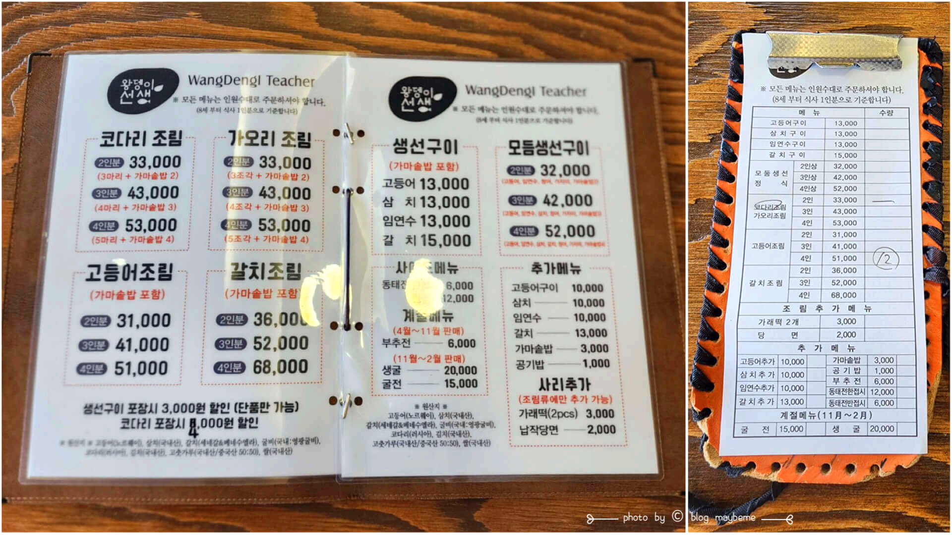 메뉴판입니다. 저희는 코다리 조림 2인분을 주문했습니다. 2인분에 생선 3마리와 가마솥밥이 나오고 가격은 33,000원입니다.