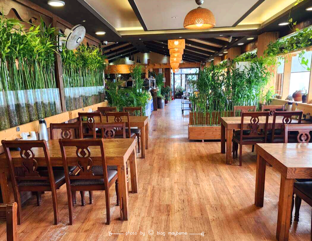 자리는 테이블의 형식으로 의자에 앉아서 식사할 수 있고 더 안쪽으로 들어가게 되면 가운데 파티션 같은 벽을 중심으로 2곳으로 공간이 나누어져 있어요. 오른쪽의 공간은 단체석인 듯했어요. 테이블들의 길이가 더 길고 의자도 다른 공간의 자리보다 더 많이 있었어요. 저희는 왼쪽의 공간에서 식사를 했는데 4인 테이블들이 있는 공간이었어요. 자리가 깨끗해서 맘에 들었습니다.