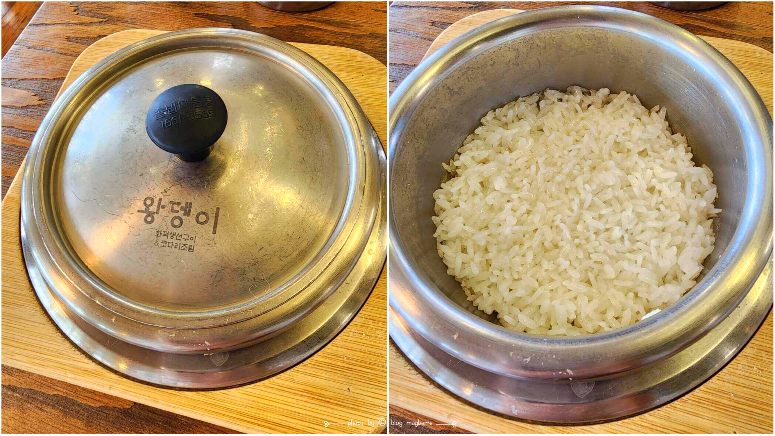 솥밥은 각 개인당 하나씩 나왔어요. 솥의 무게는 생각보다 무겁지 않았어요. 밥의 양도 한 그릇의 3분의 2 정도 인 양으로 저한테는 적당했어요. 따뜻한 물 주전자는 테이블마다 이미 배치되어 있었어요. 저는 가득 담는 걸 선호하는 편이라서 물을 많이 넣었어요.