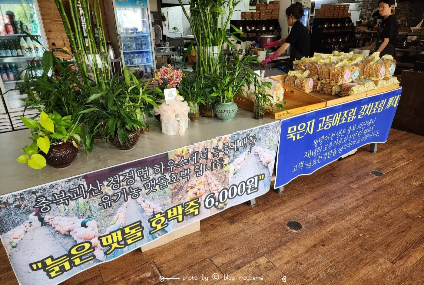 유기농 늙은 맷돌 호박죽을 구매할 수 있고 누룽지도 구매할 수 있는 진열장도 있습니다.