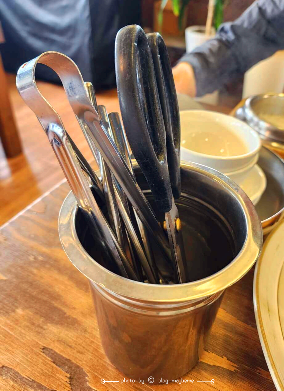 테이블에는 따로 수저통이 있지 않고 음식이 나올 때 가위랑 집게 수저가 따로 통에 담겨 나왔어요. 인원수에 맞게 수저를 따로 주는 것 같아요.