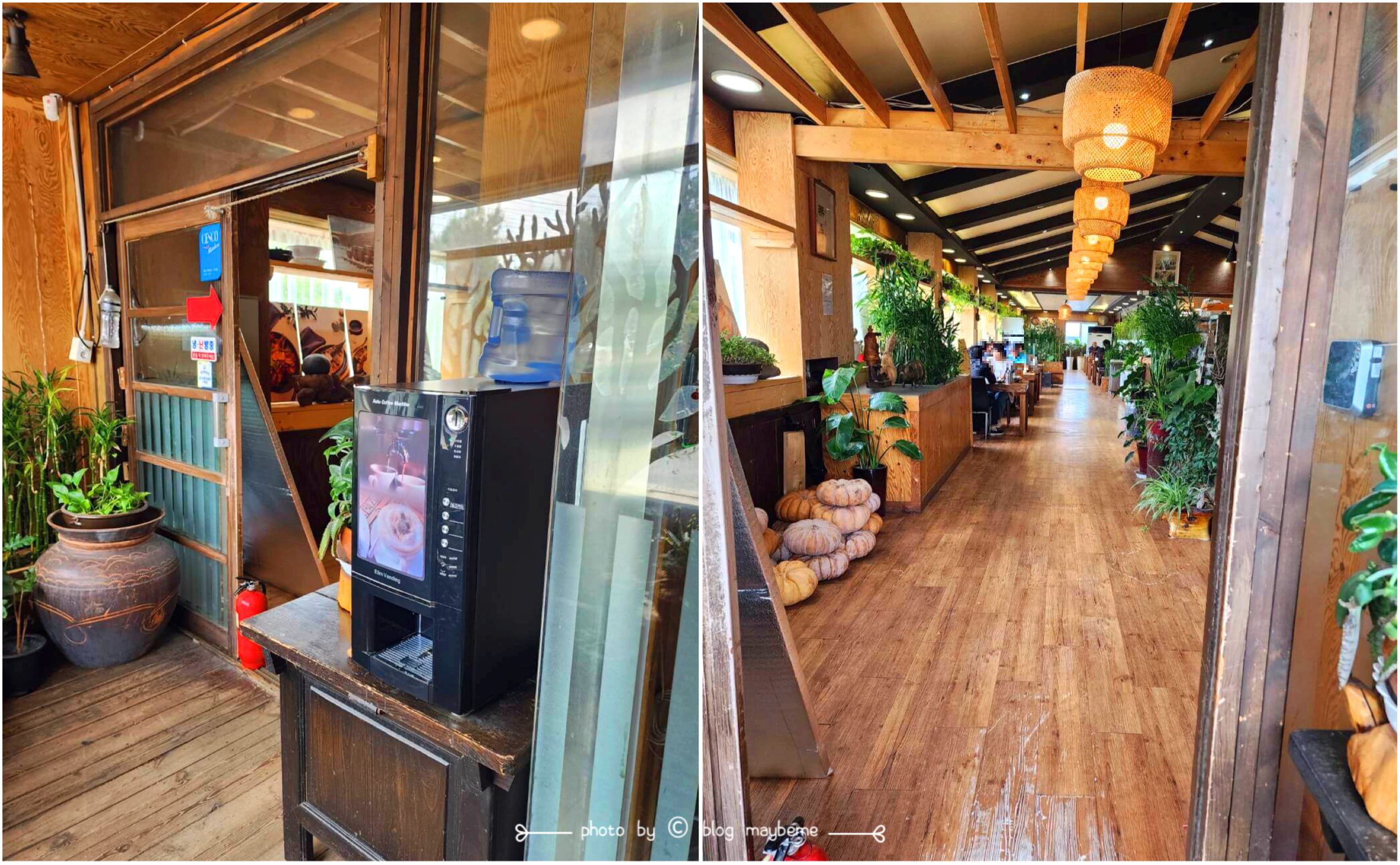 출입문에는 어느 식당에나 하나씩은 있는 커피머신이 있어요. 출입문도 나무프레임에 유리로 되어 있습니다. 안쪽 내부 모습은 라탄조명등에 여시나 식물과 화분이 많이 있어서 자연적인 분위기를 느낄 수 있어요. 생선구이하는 식당인데 생선냄새가 나지 않아서 좋았어요.