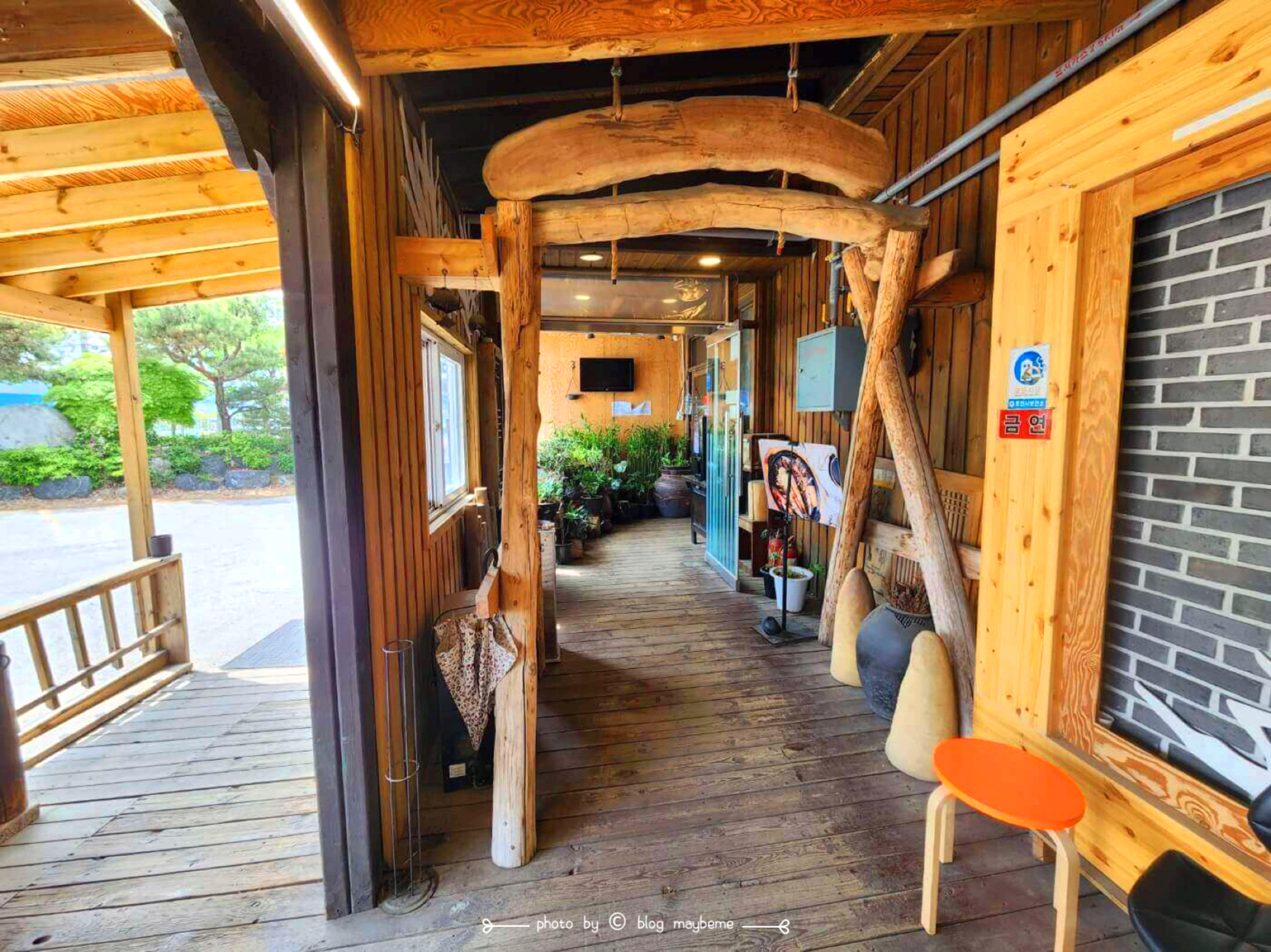 주차를 하고 입구로 들어가는데 인테리어가 나무로 되어 있어서 분위기가 예스러웠어요. 들어가는 입구 안쪽에는 식물도 있어서 뭔가 시골스러운 느낌도 들면서 자연과 함께 인듯한 느낌을 갖게 해주는 것 같아요.