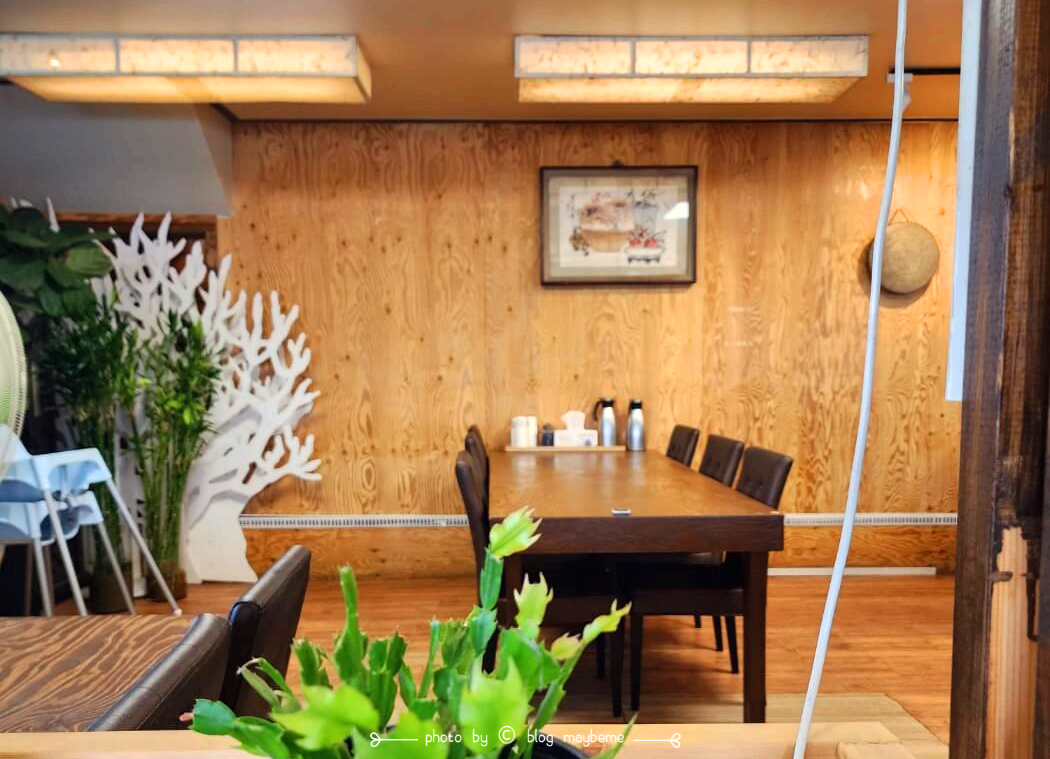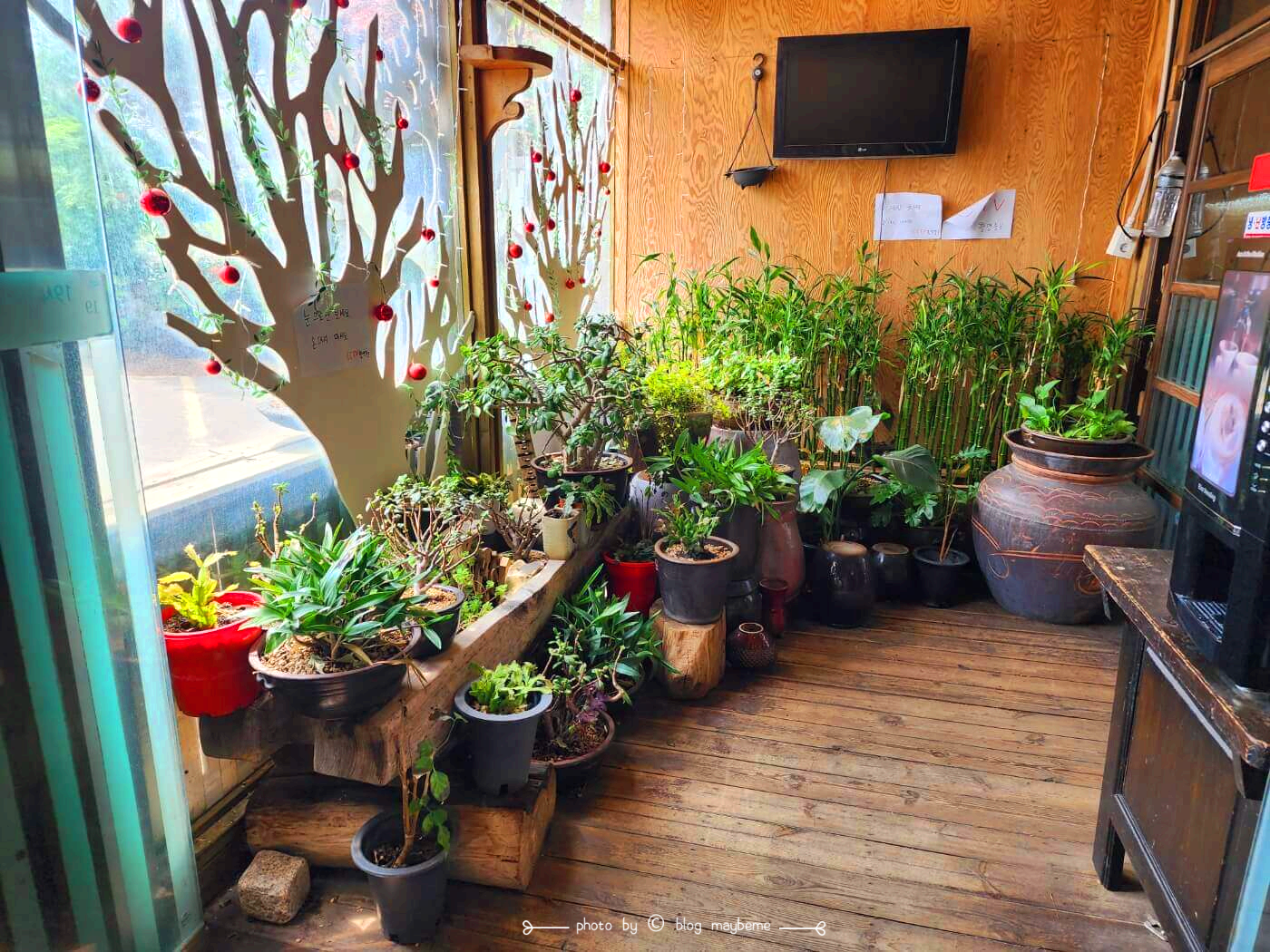 주차를 하고 입구로 들어가는데 인테리어가 나무로 되어 있어서 분위기가 예스러웠어요. 들어가는 입구 안쪽에는 식물도 있어서 뭔가 시골스러운 느낌도 들면서 자연과 함께 인듯한 느낌을 갖게 해주는 것 같아요.