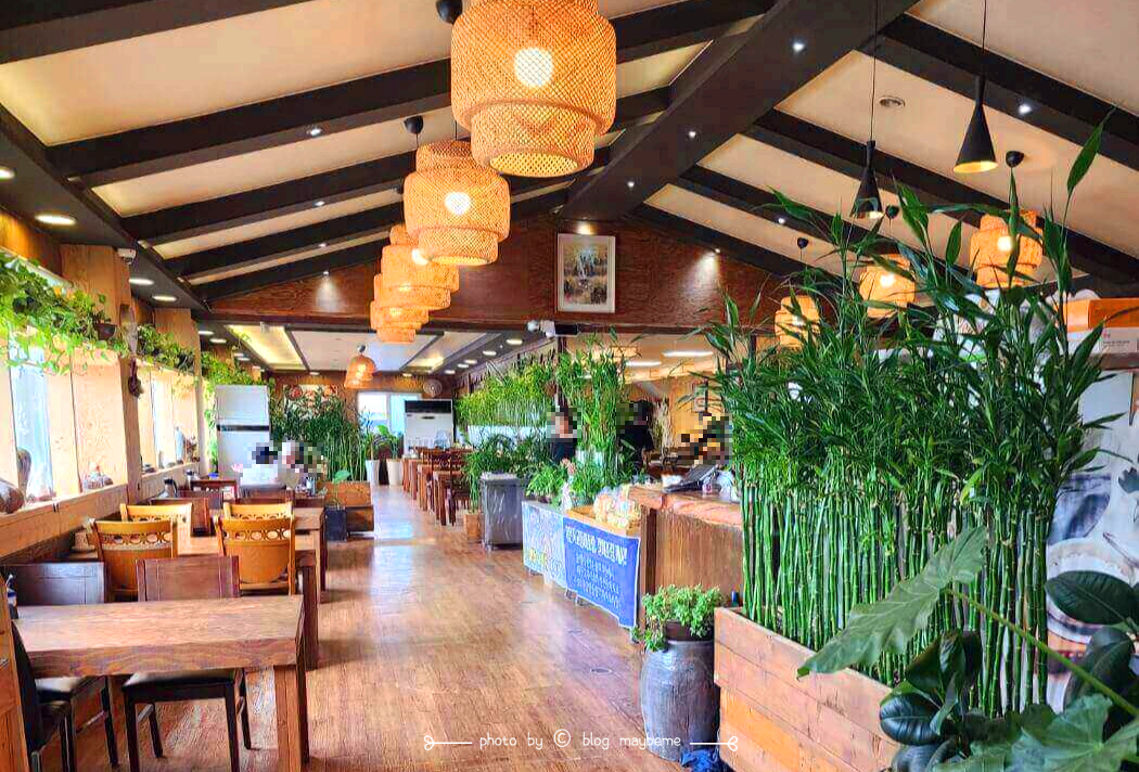 출입문에는 어느 식당에나 하나씩은 있는 커피머신이 있어요. 출입문도 나무프레임에 유리로 되어 있습니다. 안쪽 내부 모습은 라탄조명등에 여시나 식물과 화분이 많이 있어서 자연적인 분위기를 느낄 수 있어요. 생선구이하는 식당인데 생선냄새가 나지 않아서 좋았어요.