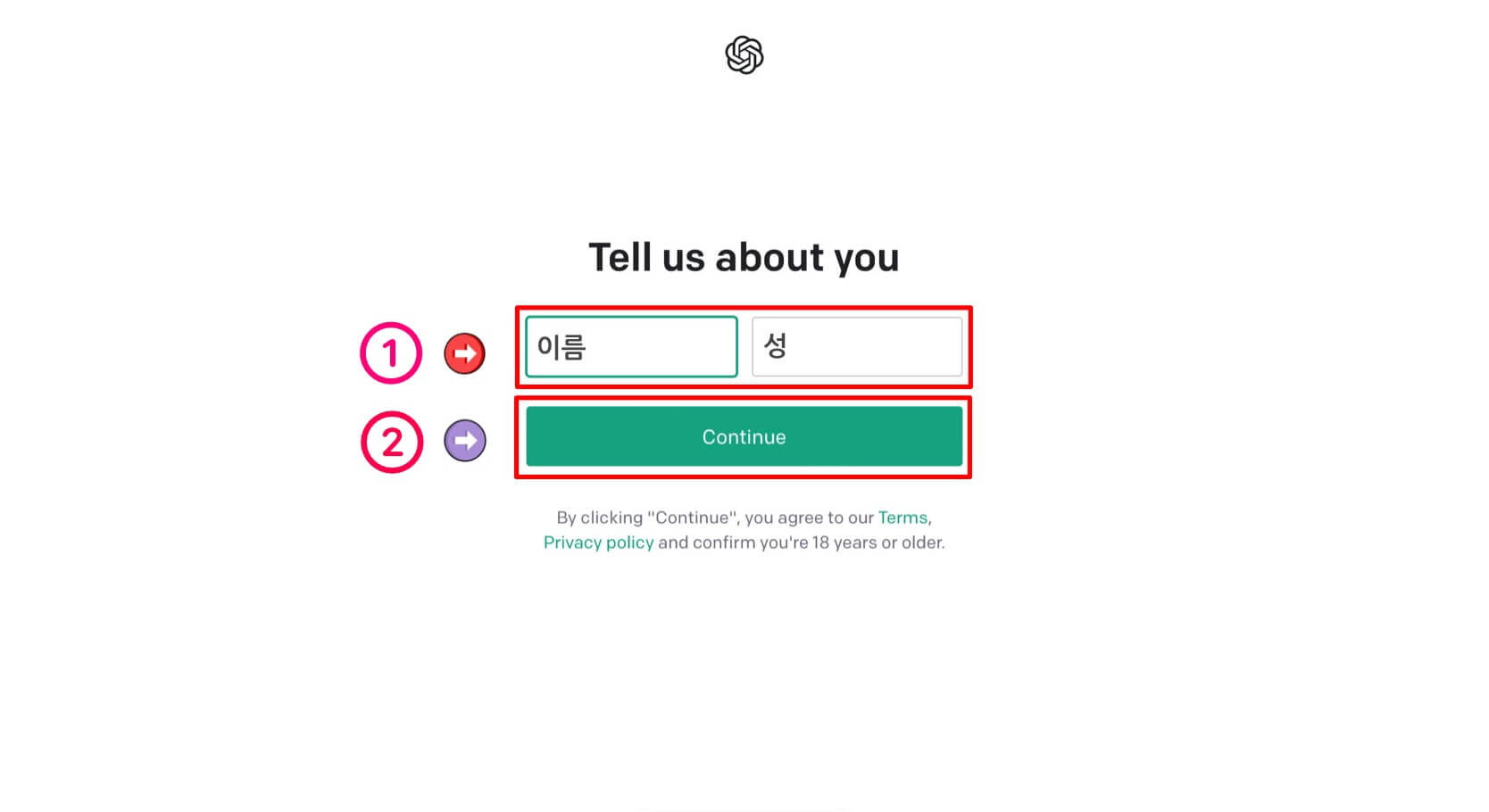 5. 이름과 성 입력하고 'countinue : 계속하기'로 다음화면으로 넘어갑니다.
